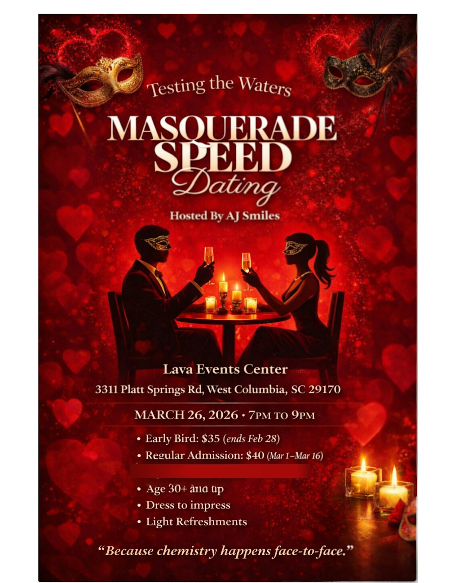 by admin13Feb Testing the Waters Masquerade Speed Dating at Lava Events Center LLC – West Columbia, SC Testing the Waters Masquerade Speed Dating at Lava Events Center LLC – West Columbia, SC 2 2 people viewed this event. Dive into fun and mystery at Testing the Waters Masquerade Speed Dating—where sparks fly behind the masks! Tickets-RSVP Link Date And Time Thursday, March 26th, 2026 11:00 PM (PST) Venue Lava Events Center LLC Location 3311 Platt Springs Road, West Columbia, SC 29170 Event Types Community & CultureParty or Social Gathering Event Category South Carolina Share With Friends Facebook Twitter Linkedin Xing Pinterest Share This Post: