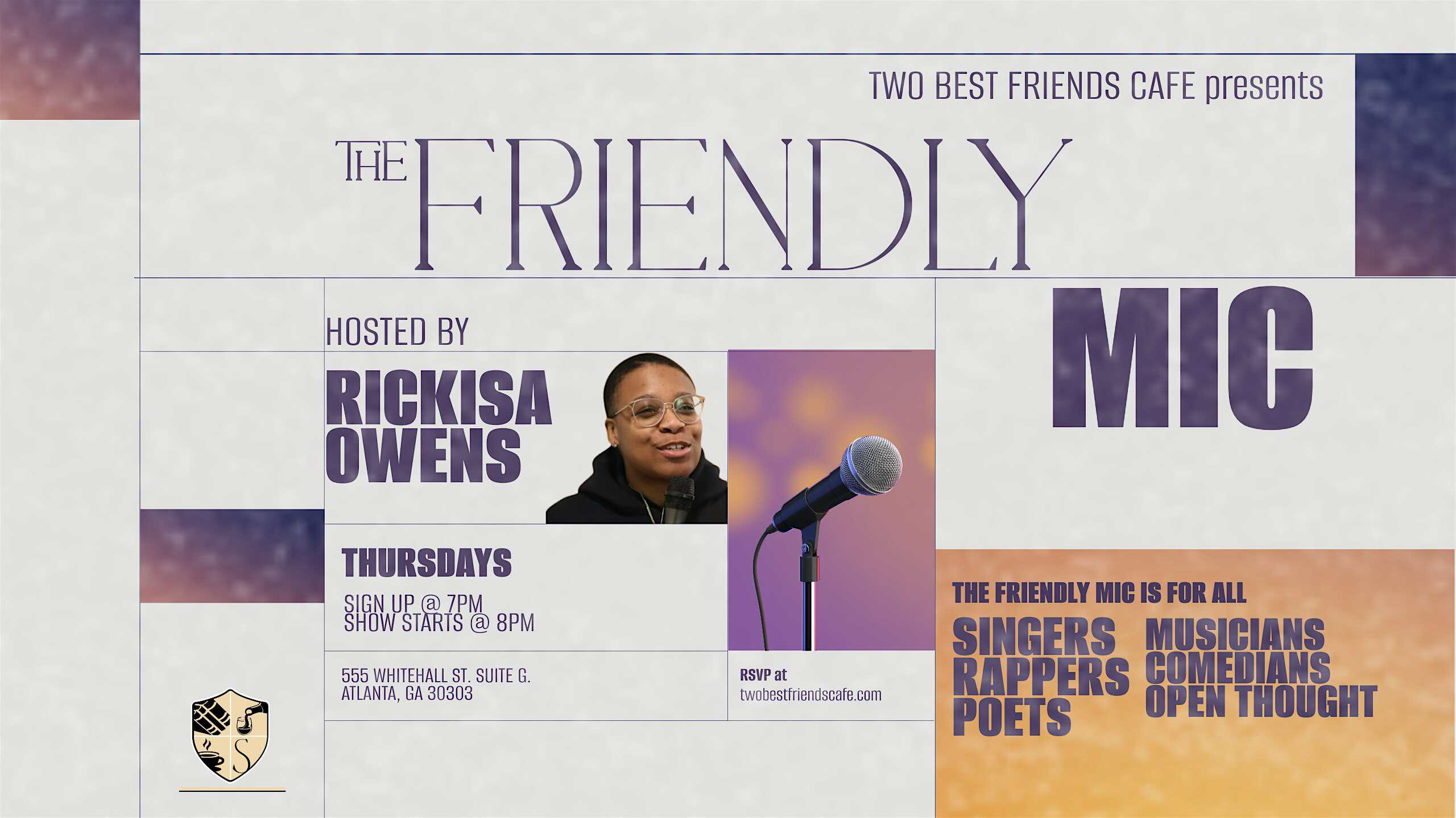 by admin14Feb The Friendly Mic at Two Best Friends Cafe & Books – Atlanta, GA The Friendly Mic at Two Best Friends Cafe & Books – Atlanta, GA 2 2 people viewed this event. Monthly Open Mic for brave, beginning, and experimenting souls in a judgement-free environment! Tickets-RSVP Link Date And Time Thursday, March 26th, 2026 11:00 PM (PST) Venue Two Best Friends Cafe & Books Location 555 Whitehall Street Southwest, Atlanta, GA 30303 Event Types Concert or PerformancePerforming & Visual Arts Event Category AtlantaGeorgia Share With Friends Facebook Twitter Linkedin Xing Pinterest Share This Post: