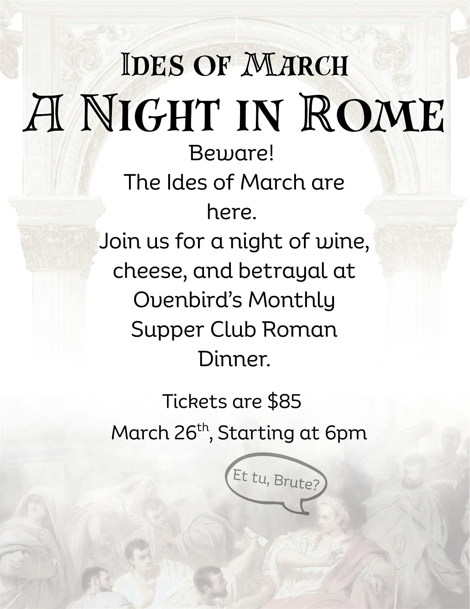 by admin23Feb The Ides of March | A Night in Rome at Ovenbird | Austin – Austin, TX The Ides of March | A Night in Rome at Ovenbird | Austin – Austin, TX 3 3 people viewed this event. Step into ancient Rome for a wild night of drama, drinks, and unforgettable vibes that’ll have you feeling like a true Gladiator. Tickets-RSVP Link Date And Time Thursday, March 26th, 2026 06:00 PM (PST) Venue Ovenbird | Austin Location 6501 South Congress Avenue, Austin, TX 78745 Event Types Food & DrinkParty or Social Gathering Event Category AustinTexas Share With Friends Facebook Twitter Linkedin Xing Pinterest Share This Post: