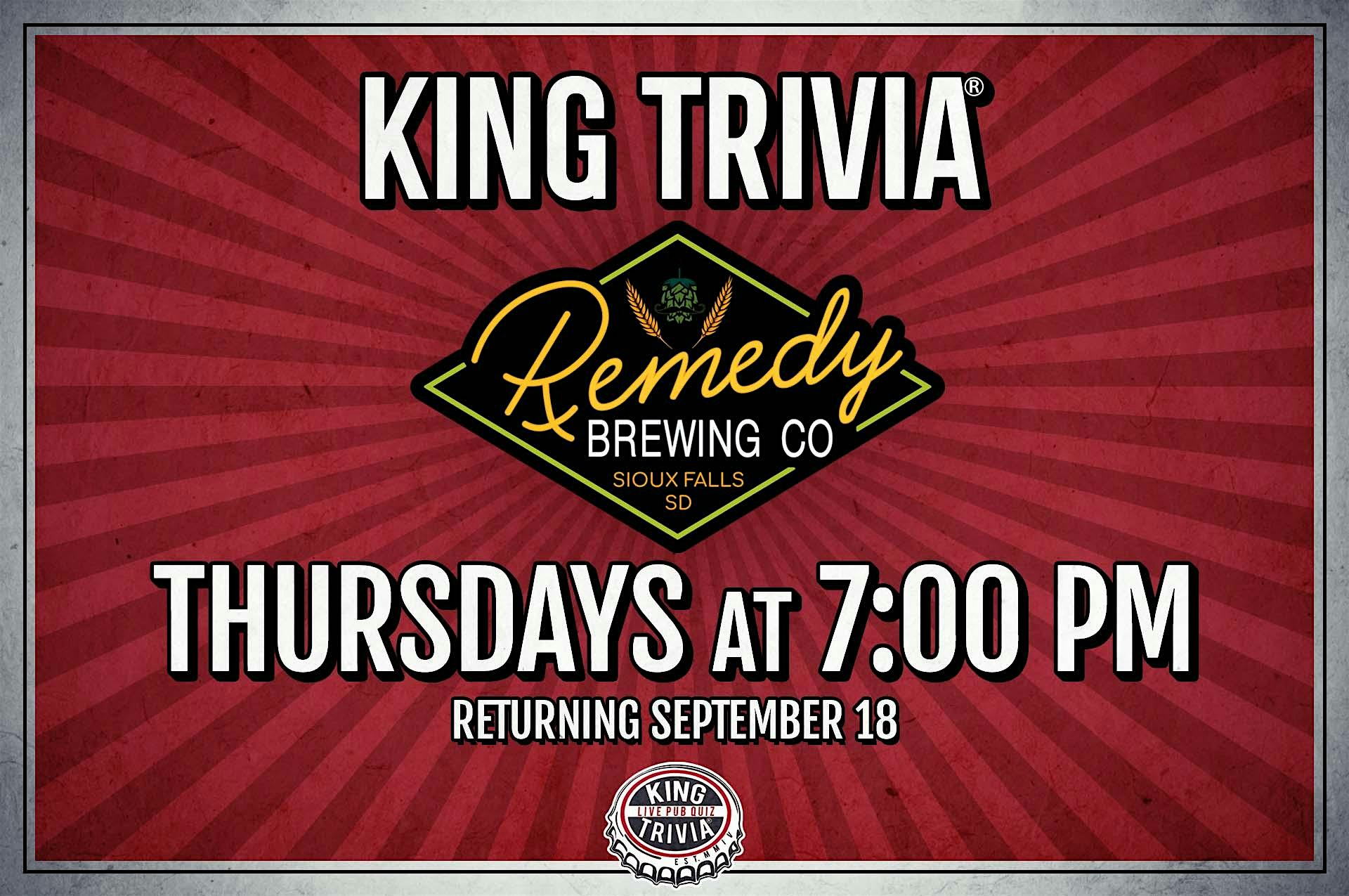 Trivia Night at Remedy Brewing at Remedy Brewing Company – Sioux Falls, SD Trivia Night at Remedy Brewing at Remedy Brewing Company – Sioux Falls, SD 1 1 people viewed this event. Your Weekly Bar Trivia Challenge! Drink a beer, munch some food, and compete for glory & prizes! FREE to play! Tickets-RSVP Link Register for event Date And Time Thursday, March 26th, 2026 @ 07:00 PM Location 401 East 8th Street, Sioux Falls, SDĀ 57103 Event Types Food & DrinkGame or Competition Event Category South Dakota Share With Friends Facebook Twitter Linkedin Xing Pinterest