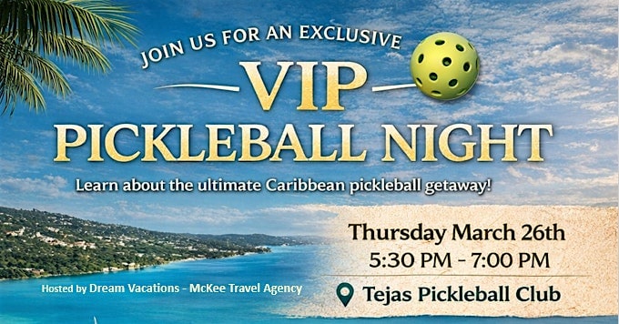 by admin14Feb VIP Pickleball Night presented by Sandals Resorts at Tejas Pickleball Club – Georgetown, TX VIP Pickleball Night presented by Sandals Resorts at Tejas Pickleball Club – Georgetown, TX 2 2 people viewed this event. Learn about the ultimate Caribbean pickleball getaway! Hosted by Dream Vacations – McKee Travel Agency. Tickets-RSVP Link Date And Time Thursday, March 26th, 2026 10:00 PM (PST) Venue Tejas Pickleball Club Location 4701 Farm to Market Road 3405, Georgetown, TX 78633 Event Types Party or Social Gathering Event Category Texas Share With Friends Facebook Twitter Linkedin Xing Pinterest Share This Post: