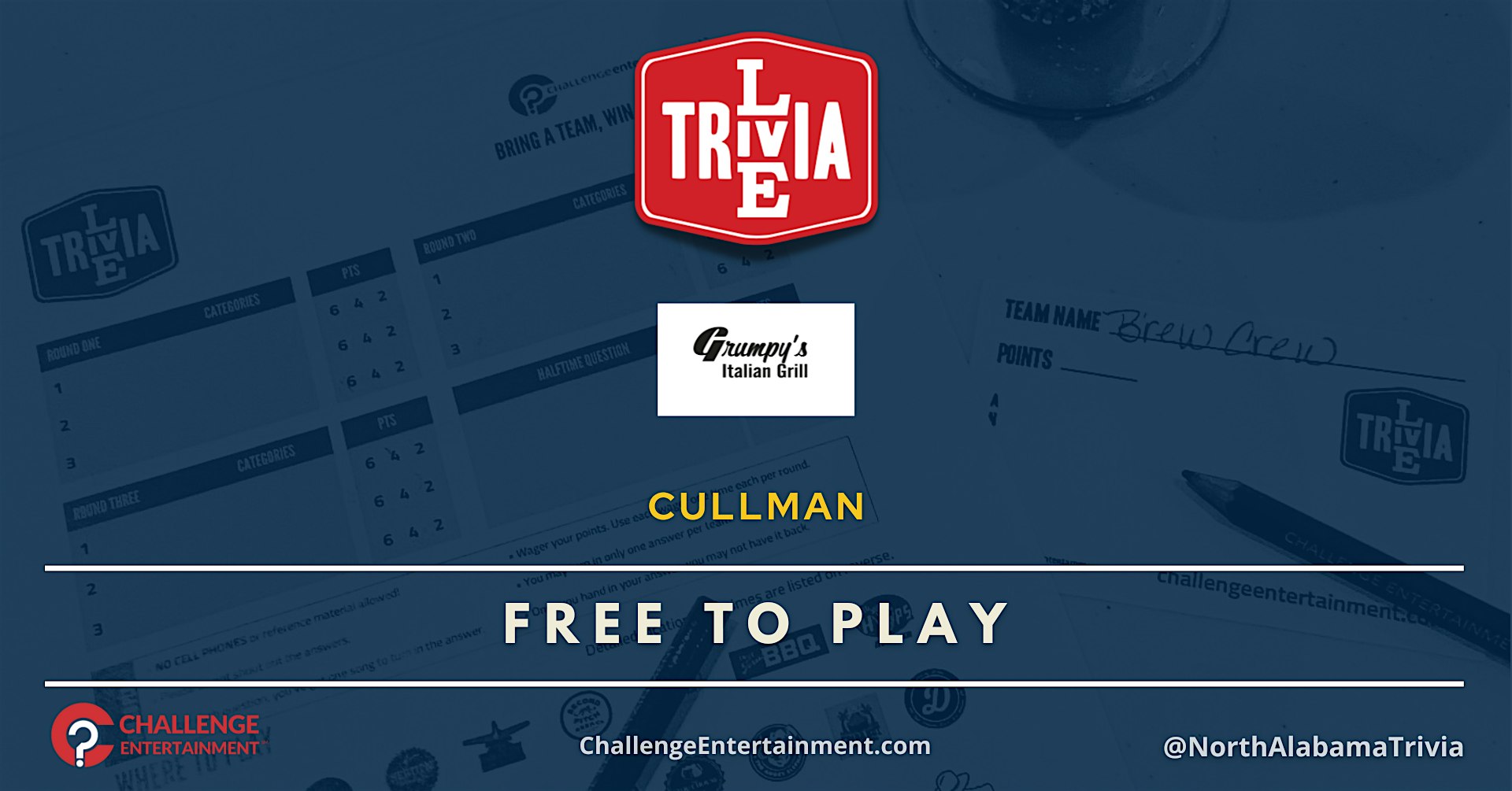 Weekly Live Trivia Nights at Grumpy’s Italian Grill – Cullman at Grumpy’s Italian Grill – Cullman, AL Weekly Live Trivia Nights at Grumpy’s Italian Grill – Cullman at Grumpy’s Italian Grill – Cullman, AL 1 1 people viewed this event. Weekly Live Trivia Nights at Grumpy’s Italian Grill – Cullman Tickets-RSVP Link Register for event Date And Time Thursday, March 26th, 2026 @ 06:00 PM Location 402 5th Street Southwest, Cullman, ALĀ 35055 Event Types Food & DrinkGame or Competition Event Category Alabama Share With Friends Facebook Twitter Linkedin Xing Pinterest