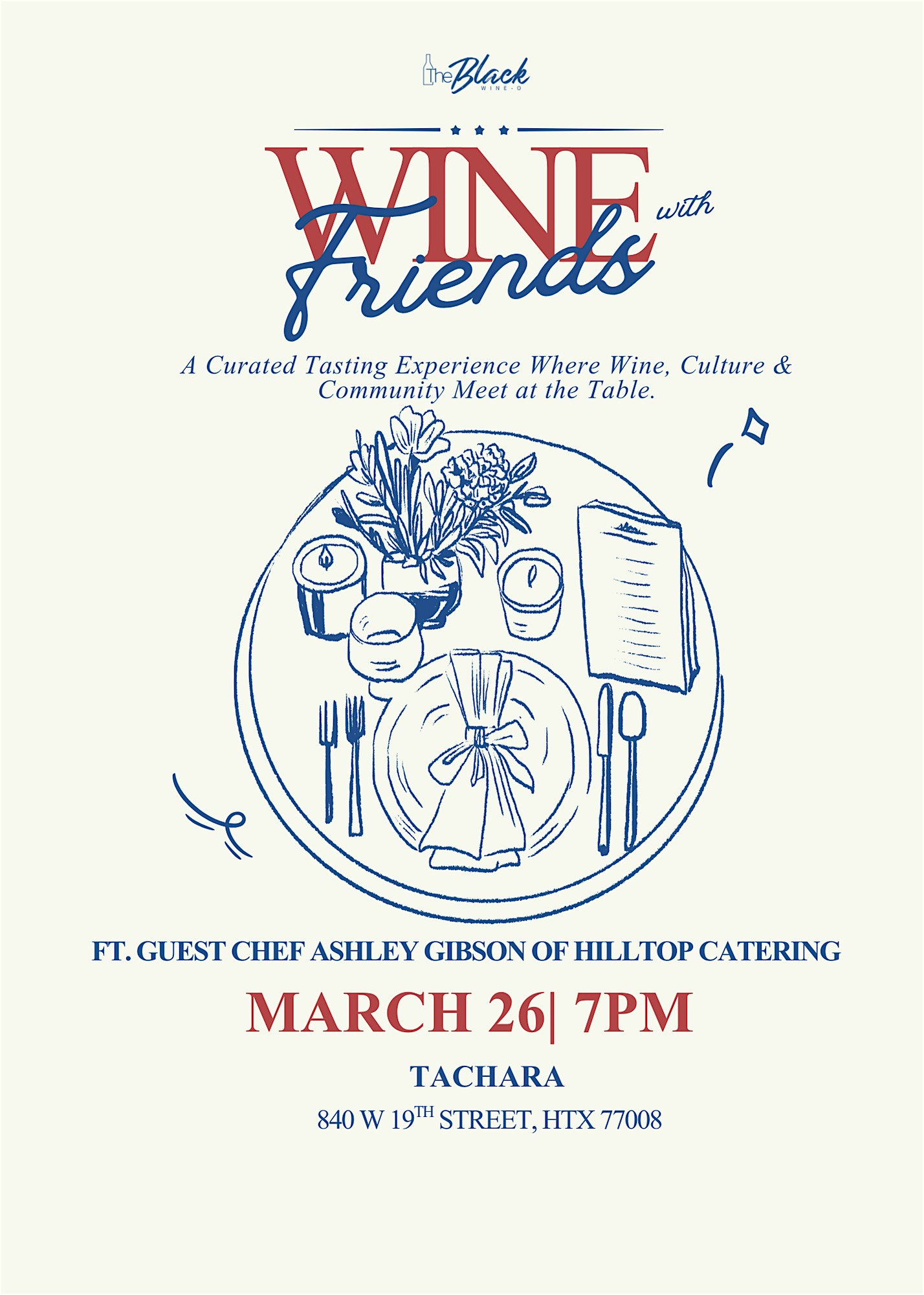 by admin24Feb Wine With Friends at Tachara – Houston, TX Wine With Friends at Tachara – Houston, TX 2 2 people viewed this event. A curated tasting experience where wine, culture and community meet at the table. Tickets-RSVP Link Date And Time Thursday, March 26th, 2026 07:00 PM (PST) Venue Tachara Location 840 West 19th Street, Houston, TX 77008 Event Types Food & Drink Event Category HoustonTexas Share With Friends Facebook Twitter Linkedin Xing Pinterest Share This Post: