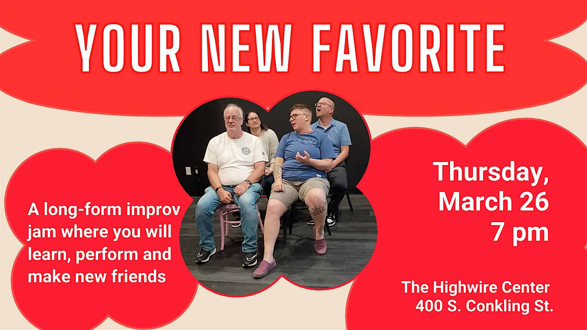 by admin14Feb Your New Favorite: A Community Improv Jam at Highwire Improv – Baltimore, MD Your New Favorite: A Community Improv Jam at Highwire Improv – Baltimore, MD 2 2 people viewed this event. Meet new people and do some improv in a supportive environment at the new Highwire Center! Led by Barry Wright III! Tickets-RSVP Link Date And Time Thursday, March 26th, 2026 11:00 PM (PST) Venue Highwire Improv Location 400 S. Conkling Street, Baltimore, MD 21224 Event Types Concert or PerformancePerforming & Visual Arts Event Category BaltimoreMaryland Share With Friends Facebook Twitter Linkedin Xing Pinterest Share This Post: