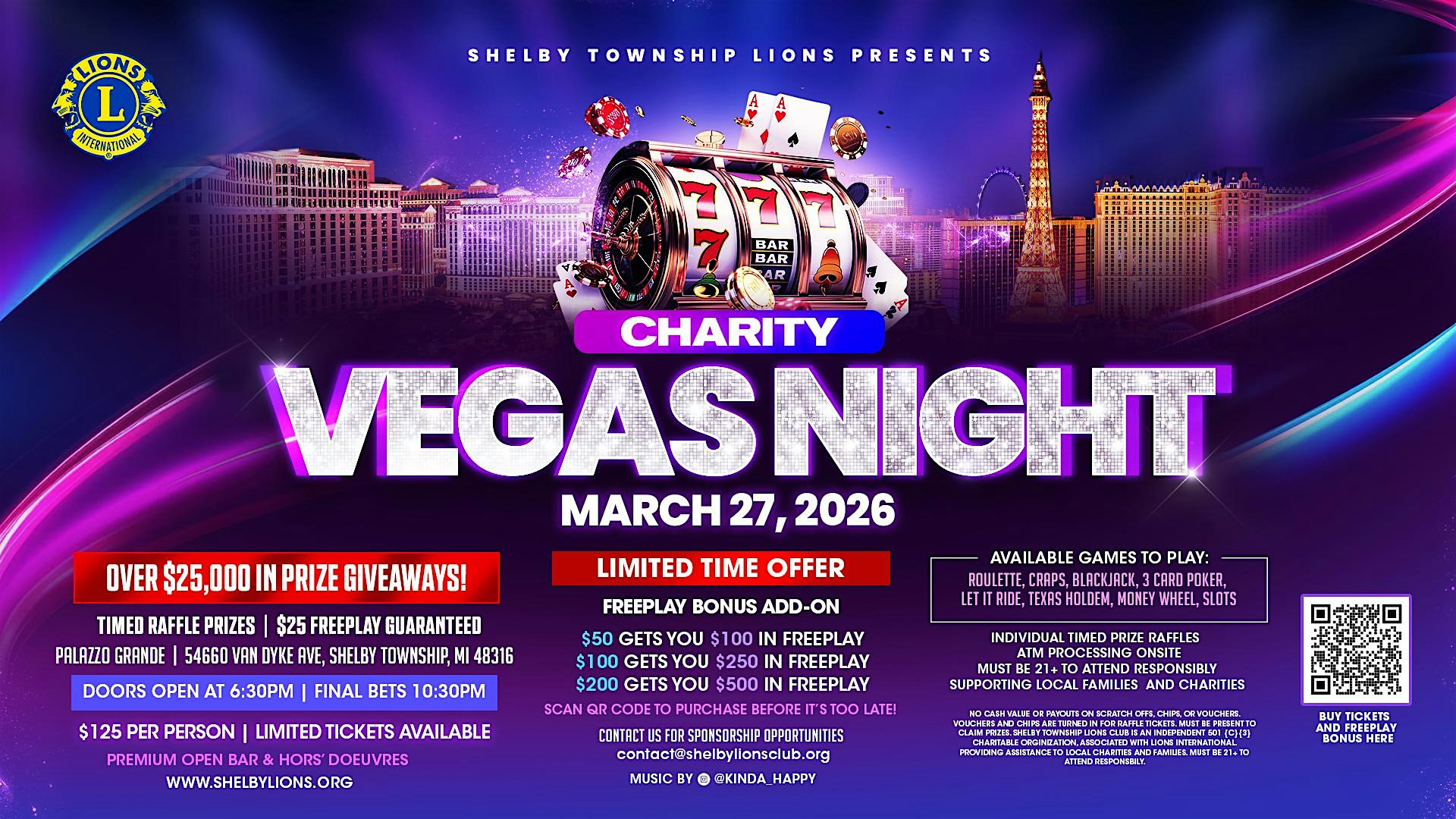 by admin13Feb 2026 Charity Vegas Night Presented by Shelby Townships Lions International at The Palazzo Grande – Shelby Township, MI 2026 Charity Vegas Night Presented by Shelby Townships Lions International at The Palazzo Grande – Shelby Township, MI 2 2 people viewed this event. Join us for a night of fun and giving at our Charity Vegas Night, presented by Shelby Townships Lions Club, on February 21, 2025! Tickets-RSVP Link Date And Time Friday, March 27th, 2026 10:00 PM (PST) Venue The Palazzo Grande Location 54660 Van Dyke Avenue, Shelby Township, MI 48316 Event Types Charity & CausesParty or Social Gathering Event Category Michigan Share With Friends Facebook Twitter Linkedin Xing Pinterest Share This Post: