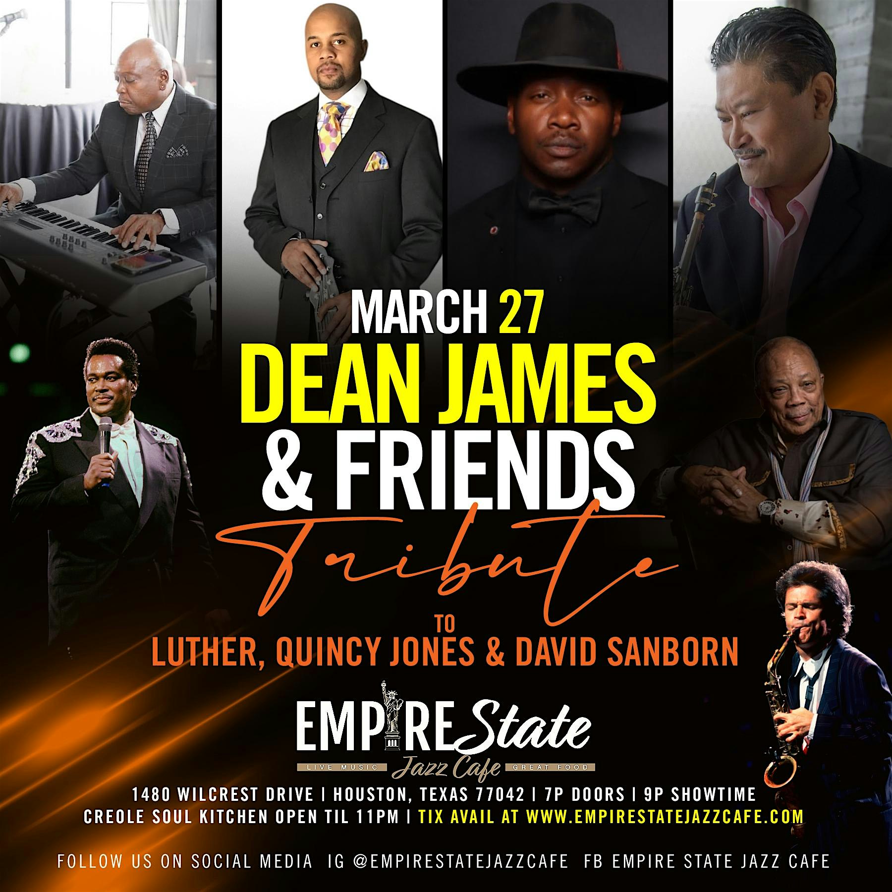 by admin24Feb 3/27 – Jazz Tribute to Luther Vandross, Quincy Jones & David Sanborn at Empire State Jazz Cafe – Houston, TX 3/27 – Jazz Tribute to Luther Vandross, Quincy Jones & David Sanborn at Empire State Jazz Cafe – Houston, TX 2 2 people viewed this event. Dean James & The Alvin King Trio Tribute to Luther Vandross, Quincy Jones & David Sanborn Tickets-RSVP Link Date And Time Friday, March 27th, 2026 07:00 PM (PST) Venue Empire State Jazz Cafe Location 1480 Wilcrest Drive, Houston, TX 77042 Event Types Concert or PerformanceMusic Event Category HoustonTexas Share With Friends Facebook Twitter Linkedin Xing Pinterest Share This Post: