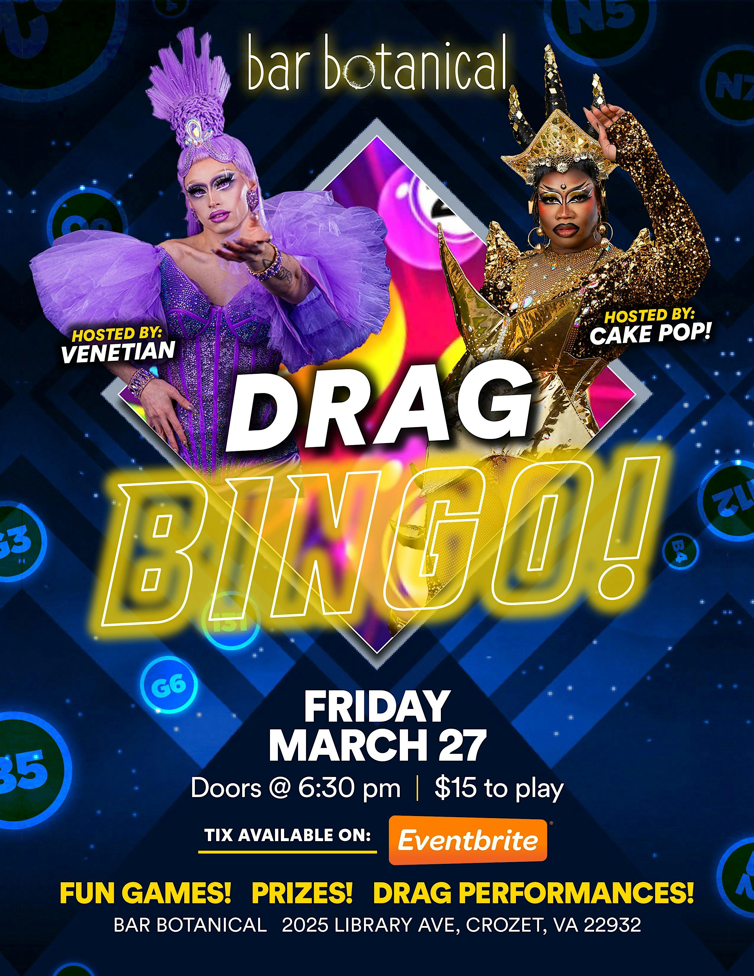 by admin27Feb Bar Botanical Drag Bingo (Crozet) at Bar Botanical – Crozet, VA Bar Botanical Drag Bingo (Crozet) at Bar Botanical – Crozet, VA 1 1 people viewed this event. Bar Botanical’s Drag Bingo! Featuring Host Cake Pop! & Venetian! Tickets-RSVP Link Date And Time Friday, March 27th, 2026 @ 07:00 PM Location 2025 Library Avenue, Crozet, VA 22932 Event Types Community & CultureParty or Social Gathering Event Category Virginia Share With Friends Facebook Twitter Linkedin Xing Pinterest Share This Post:
