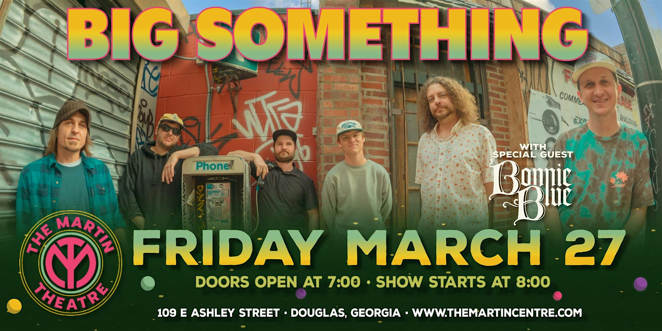 by admin24Feb Big Something With Special Guest Bonnie Blue at The Martin Centre – Douglas, GA Big Something With Special Guest Bonnie Blue at The Martin Centre – Douglas, GA 2 2 people viewed this event. The Martin Theatre presents Big Something Live in Concert Tickets-RSVP Link Date And Time Friday, March 27th, 2026 08:00 PM (PST) Venue The Martin Centre Location 109 East Ashley Street, Douglas, GA 31533 Event Types Concert or PerformanceMusic Event Category Georgia Share With Friends Facebook Twitter Linkedin Xing Pinterest Share This Post: