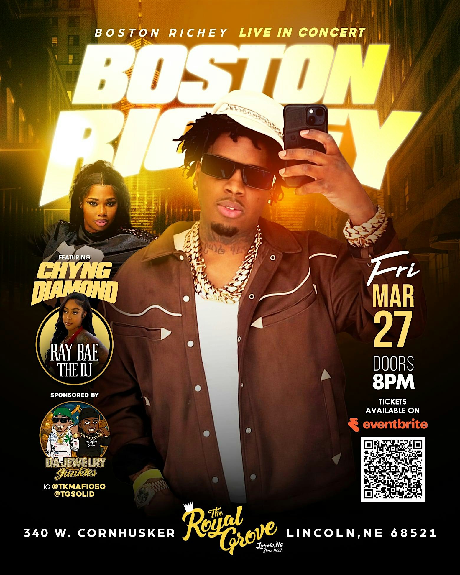 by admin24Feb Boston Richey live in concert at The Royal Grove – Lincoln, NE Boston Richey live in concert at The Royal Grove – Lincoln, NE 4 4 people viewed this event. Boston Richey and Chyng Diamond live in concert in Lincoln Nebraska this will be a sold out show come out and have great time. Tickets-RSVP Link Date And Time Friday, March 27th, 2026 08:00 PM (PST) Venue The Royal Grove Location 340 West Cornhusker Highway, Lincoln, NE 68521 Event Types Concert or PerformanceMusic Event Category Nebraska Share With Friends Facebook Twitter Linkedin Xing Pinterest Share This Post: