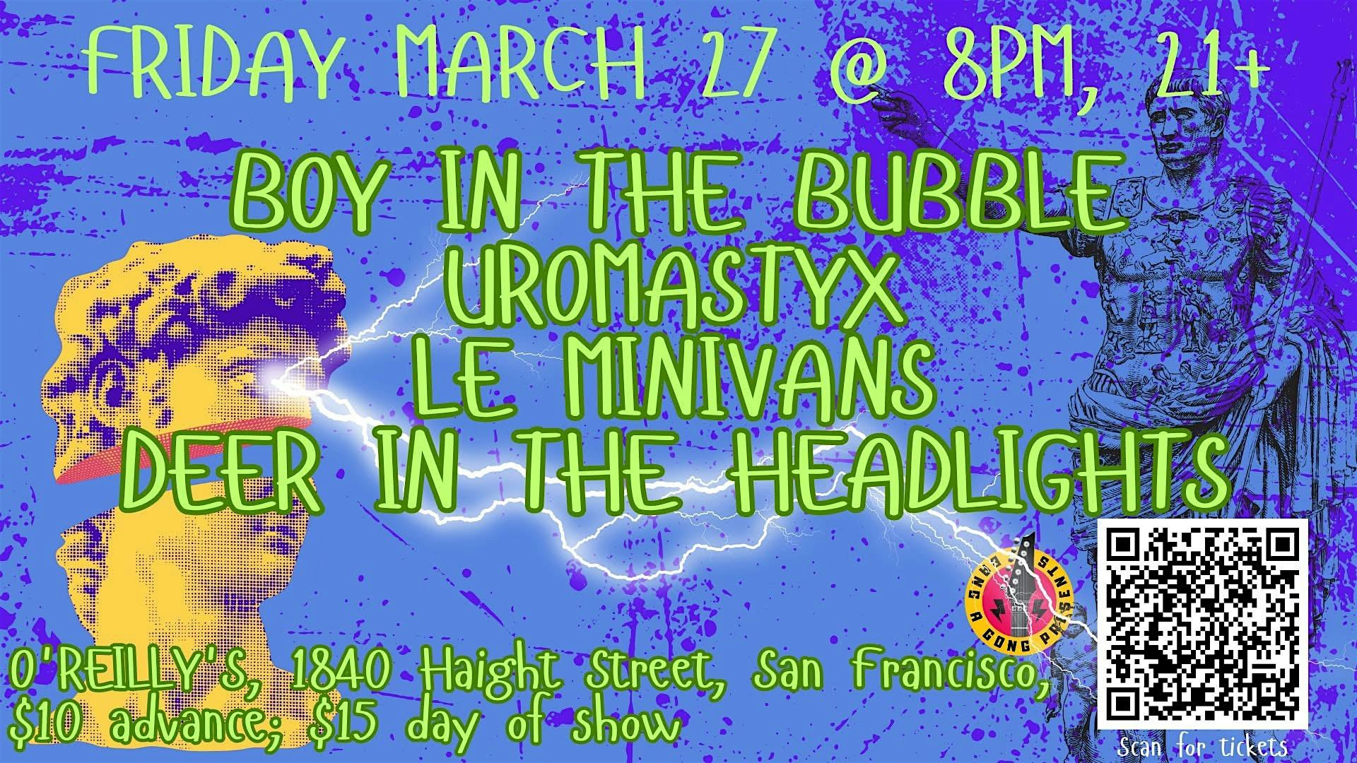 by admin27Feb BOY IN THE BUBBLE | UROMASTYX |LE MINIVANS | DEER IN THE HEADLIGHTS at oreillys pub – san francisco, CA BOY IN THE BUBBLE | UROMASTYX |LE MINIVANS | DEER IN THE HEADLIGHTS at oreillys pub – san francisco, CA 1 1 people viewed this event. Catch BOY IN THE BUBBLE, UROMASTYX, LE MINIVANS & DEER IN THE HEADLIGHTS live for a night of epic vibes! Tickets-RSVP Link Date And Time Friday, March 27th, 2026 08:00 PM (PST) Venue oreillys pub Location 1840 haight, san francisco, CA 94117 Event Types Concert or PerformanceMusic Event Category CaliforniaSan Francisco Share With Friends Facebook Twitter Linkedin Xing Pinterest Share This Post: