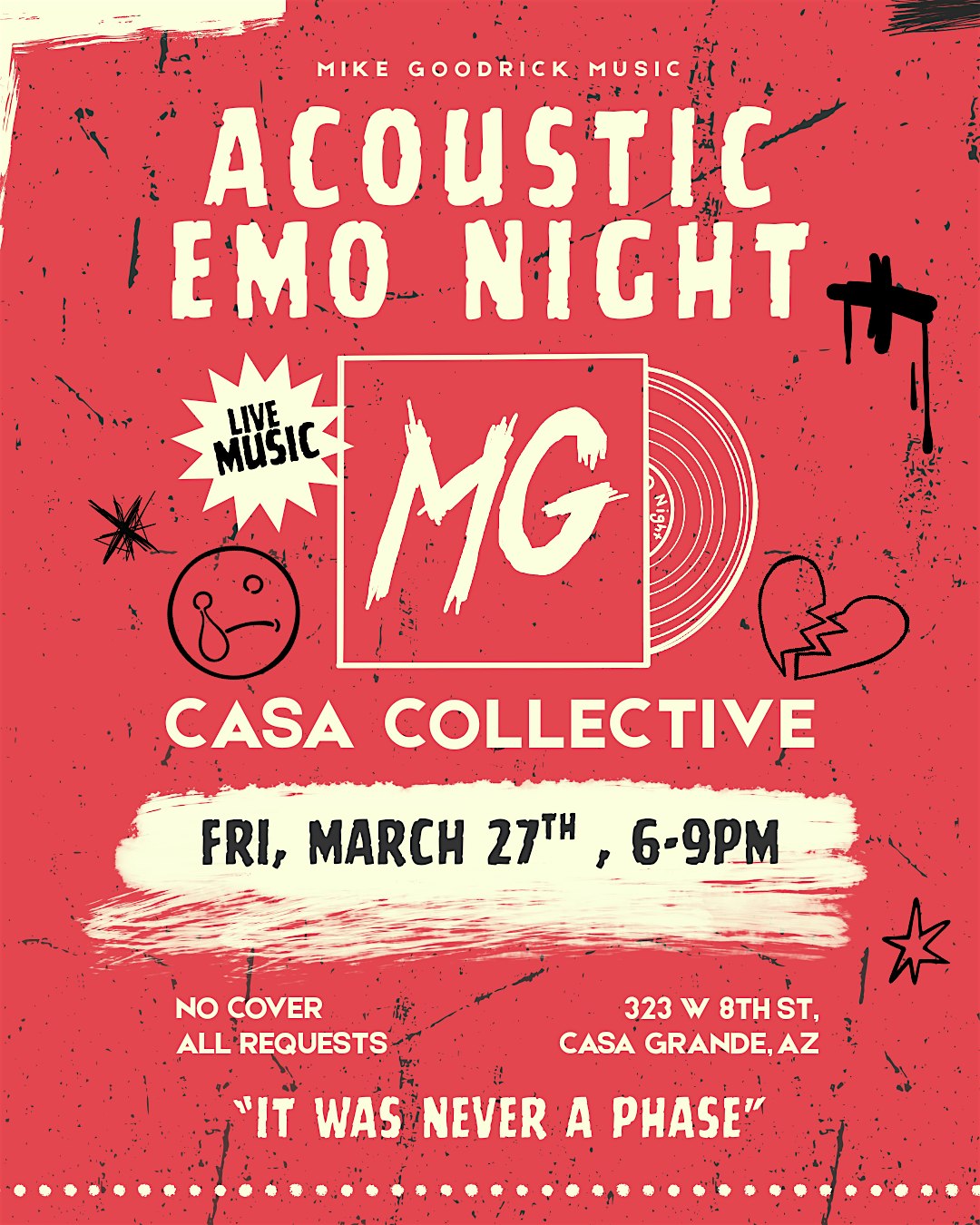 by admin24Feb Casa Grande Emo Night with Mike Goodrick at Casa Collective – Casa Grande, AZ Casa Grande Emo Night with Mike Goodrick at Casa Collective – Casa Grande, AZ 2 2 people viewed this event. Casa Grande, are you ready to scream? Mike Goodrick brings Acoustic Emo Night to Casa Collective. All requests, no cover, pure nostalgia. Tickets-RSVP Link Date And Time Friday, March 27th, 2026 06:00 PM (PST) Venue Casa Collective Location 323 West 8th Street, Casa Grande, AZ 85122 Event Types Concert or PerformanceMusic Event Category Arizona Share With Friends Facebook Twitter Linkedin Xing Pinterest Share This Post: