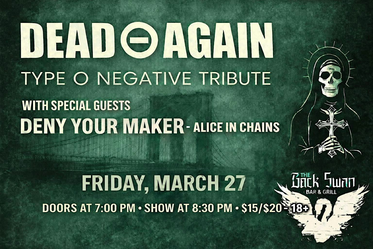 by admin24Feb Dead ⊖ Again (Type O Negative Tribute) w/ Deny Your Maker at Black Swan Bar & Grill – Hilliard, OH Dead ⊖ Again (Type O Negative Tribute) w/ Deny Your Maker at Black Swan Bar & Grill – Hilliard, OH 3 3 people viewed this event. Dead ⊖ Again (Type O Negative Tribute) w/ Deny Your Maker (Alice in Chains Tribute) Tickets-RSVP Link Date And Time Friday, March 27th, 2026 08:00 PM (PST) Venue Black Swan Bar & Grill Location 5414 Roberts Road, Hilliard, OH 43026 Event Types Concert or PerformanceMusic Event Category Ohio Share With Friends Facebook Twitter Linkedin Xing Pinterest Share This Post: