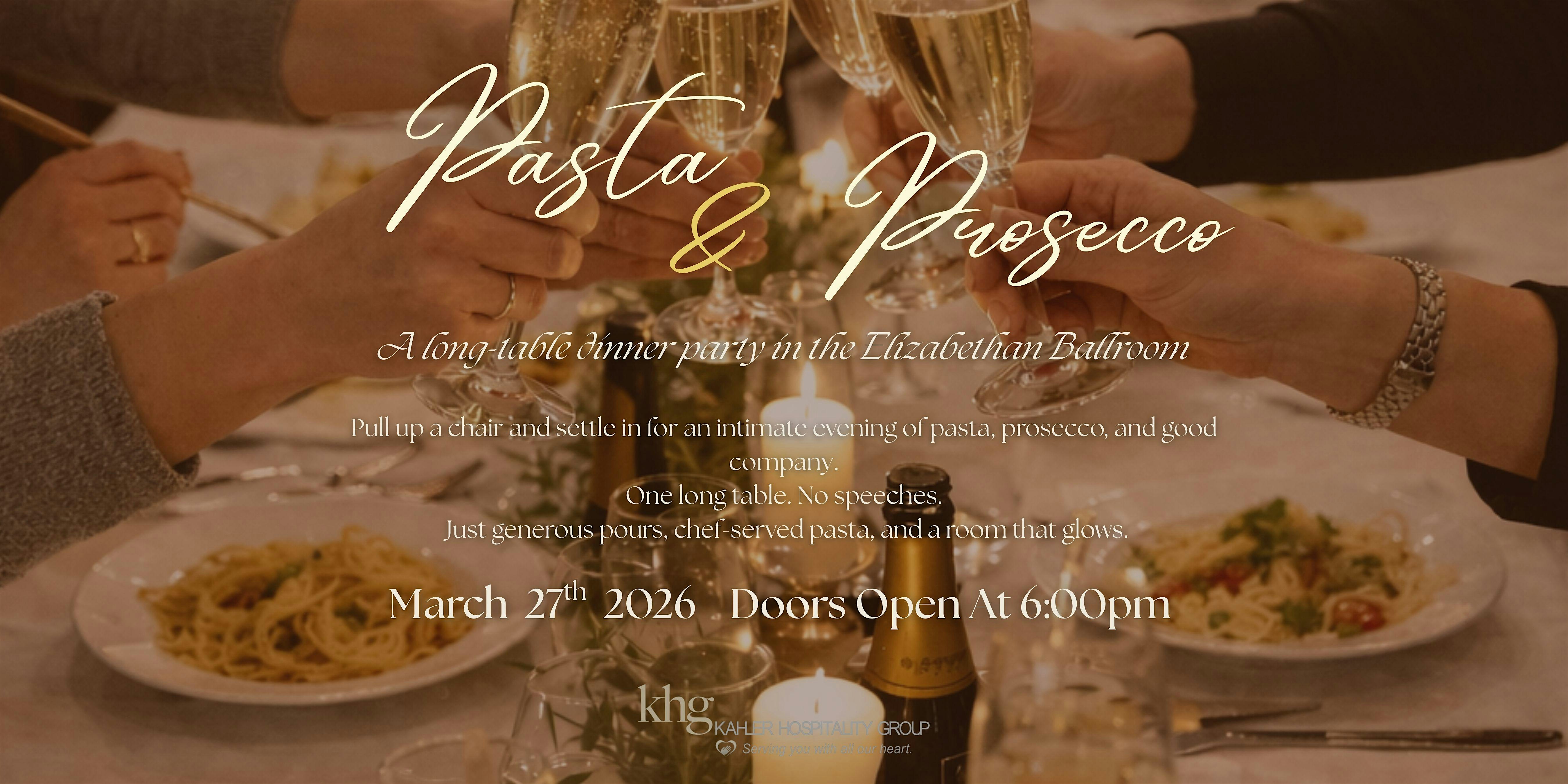 by admin24Feb Dinner Party Series: Pasta & Prosecco Night at The Kahler Grand Hotel – Rochester, MN Dinner Party Series: Pasta & Prosecco Night at The Kahler Grand Hotel – Rochester, MN 3 3 people viewed this event. Join us for a fun night of tasty pasta and bubbly Prosecco with friends at our Dinner Party Series! Tickets-RSVP Link Date And Time Friday, March 27th, 2026 06:00 PM (PST) Venue The Kahler Grand Hotel Location 20 2nd Avenue Southwest, Rochester, MN 55902 Event Types Food & Drink Event Category Minnesota Share With Friends Facebook Twitter Linkedin Xing Pinterest Share This Post: