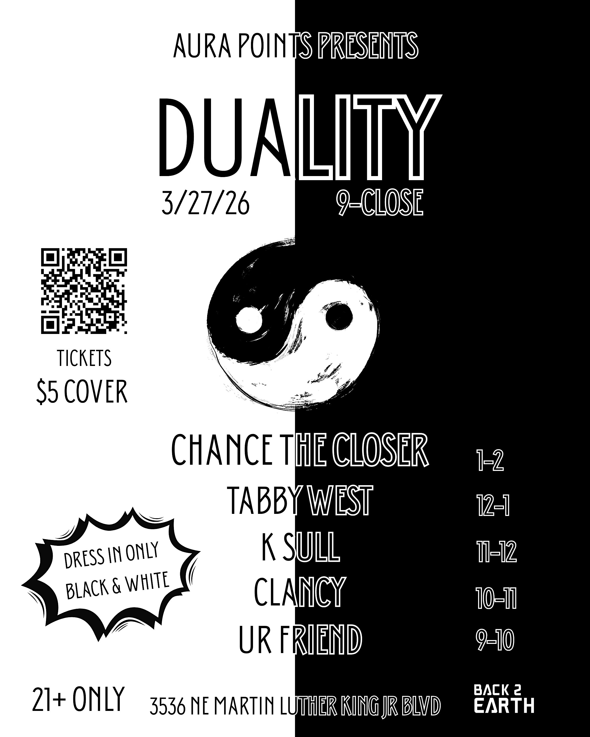 by admin27Feb DUALITY at Back2Earth – Portland, OR DUALITY at Back2Earth – Portland, OR 1 1 people viewed this event. Step into the balance of light and dark for a night where contrast collides and energy meets intention. Tickets-RSVP Link Date And Time Friday, March 27th, 2026 09:00 PM (PST) Venue Back2Earth Location 3536 Northeast Martin Luther King Junior Boulevard, Portland, OR 97212 Event Types Concert or PerformanceMusic Event Category OregonPortland Share With Friends Facebook Twitter Linkedin Xing Pinterest Share This Post:
