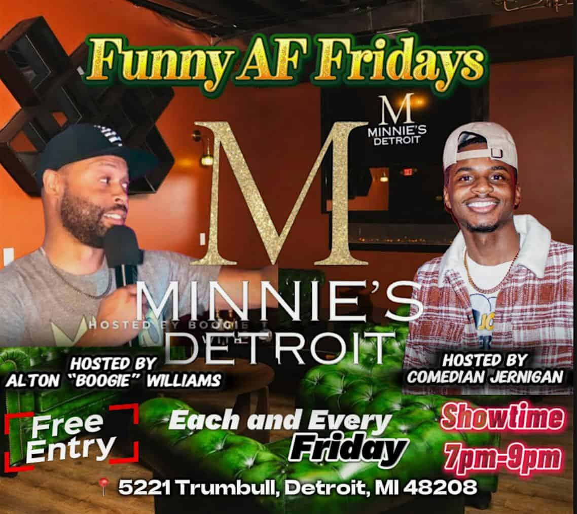 by admin14Feb Funny AF Fridays at Minnie’s Detroit – Detroit, MI Funny AF Fridays at Minnie’s Detroit – Detroit, MI 2 2 people viewed this event. Funny AF Fridays at Minnie’s Detroit only place to be, from 7pm-9pm we have live comedy featuring some of the Best comedians in the world. Tickets-RSVP Link Date And Time Friday, March 27th, 2026 11:00 PM (PST) Venue Minnie's Detroit Location 5221 Trumbull, Detroit, MI 48208 Event Types Concert or PerformancePerforming & Visual Arts Event Category DetroitMichigan Share With Friends Facebook Twitter Linkedin Xing Pinterest Share This Post: