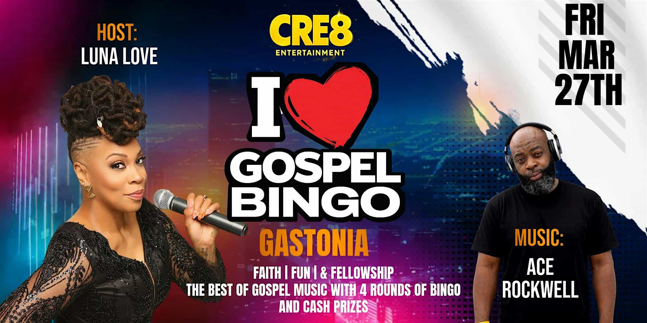 by admin23Feb GOSPEL BINGO GASTONIA – MARCH at Legacy Event Center – Gastonia, NC GOSPEL BINGO GASTONIA – MARCH at Legacy Event Center – Gastonia, NC 2 2 people viewed this event. Get ready for an unforgettable night of faith, fun, and fellowship at I Love Gospel Bingo Tickets-RSVP Link Date And Time Friday, March 27th, 2026 07:00 PM (PST) Venue Legacy Event Center Location 207 South Chestnut Street, Gastonia, NC 28054 Event Types Party or Social Gathering Event Category CharlotteNorth Carolina Share With Friends Facebook Twitter Linkedin Xing Pinterest Share This Post: