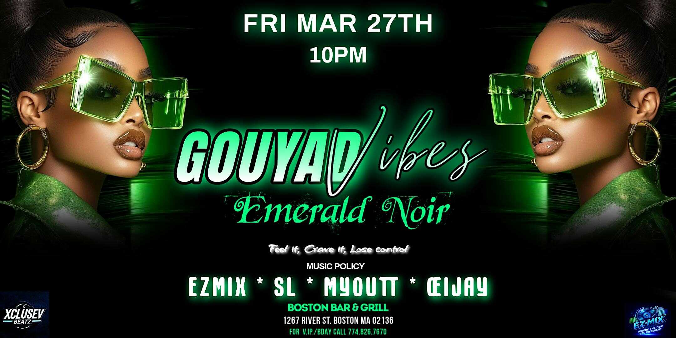 by admin23Feb GOUYAD VIBES ” EMERALD NOIR” at Boston Restaurant Bar & Grill, LLC – Boston, MA GOUYAD VIBES ” EMERALD NOIR” at Boston Restaurant Bar & Grill, LLC – Boston, MA 2 2 people viewed this event. Emerald Noir is a seductive, intimate Caribbean experience where elegance meets rhythm. Expect deep emerald lighting, sexy energy. Tickets-RSVP Link Date And Time Friday, March 27th, 2026 10:00 PM (PST) Venue Boston Restaurant Bar & Grill, LLC Location 1267 River Street, Boston, MA 2136 Event Types MusicParty or Social Gathering Event Category BostonMassachusetts Share With Friends Facebook Twitter Linkedin Xing Pinterest Share This Post: