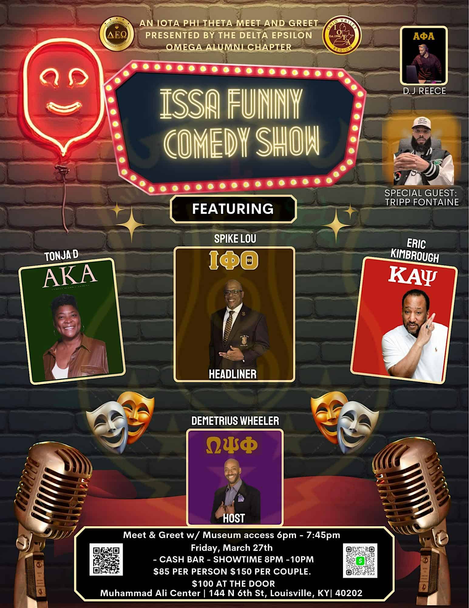 by admin14Feb ISSA FUNNY MEET & GREET COMEDY SHOW at Muhammad Ali Center – Louisville, KY ISSA FUNNY MEET & GREET COMEDY SHOW at Muhammad Ali Center – Louisville, KY 3 3 people viewed this event. A grown folks meet & greet comey show w/ museum access, cash bar, refreashments, cigar vendor and Dj. Be prepared to laugh & mingle & enjoy. Tickets-RSVP Link Date And Time Friday, March 27th, 2026 10:00 PM (PST) Venue Muhammad Ali Center Location 144 North 6th Street, Louisville, KY 40202 Event Types Concert or PerformancePerforming & Visual Arts Event Category KentuckyLouisville Share With Friends Facebook Twitter Linkedin Xing Pinterest Share This Post: