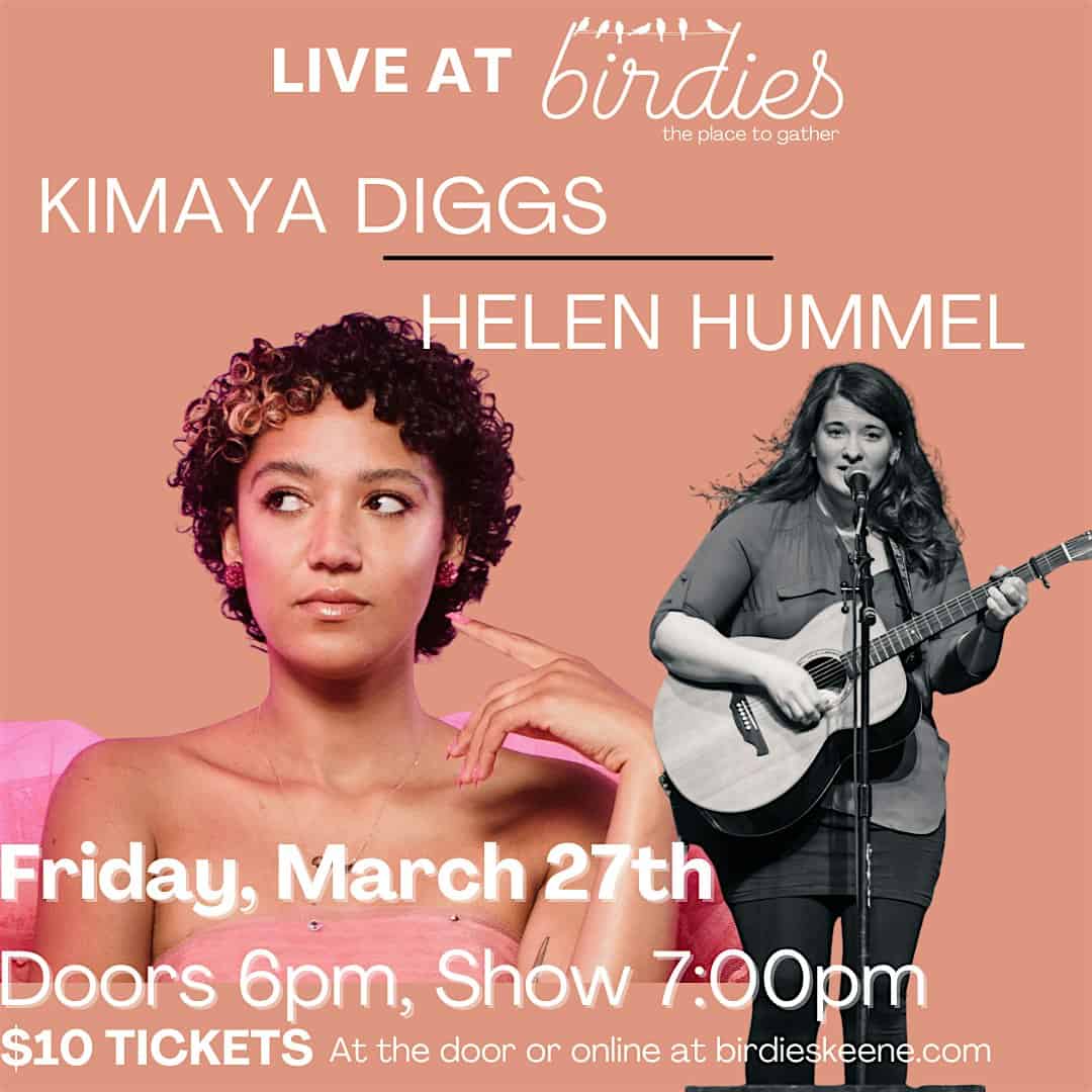 by admin14Feb Kimaya Diggs & Helen Hummel- LIVE at Birdies! at Birdies – Keene, NH Kimaya Diggs & Helen Hummel- LIVE at Birdies! at Birdies – Keene, NH 2 2 people viewed this event. 2 phenomenal singer-songwriters from Western MA! Doors at 6pm, show 7-9pm Tickets-RSVP Link Date And Time Friday, March 27th, 2026 11:00 PM (PST) Venue Birdies Location 18 Main Street, Keene, NH 3431 Event Types Concert or PerformancePerforming & Visual Arts Event Category New Hampshire Share With Friends Facebook Twitter Linkedin Xing Pinterest Share This Post: