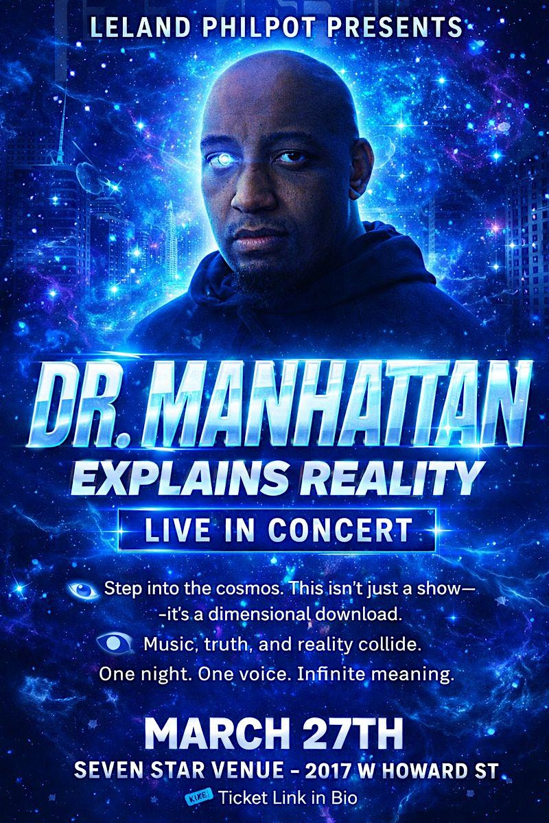 by admin24Feb Leland Philpot Presents: Dr. Manhattan Explains Reality LIVE IN CONCERT! at Seven Star Venue – Chicago, IL Leland Philpot Presents: Dr. Manhattan Explains Reality LIVE IN CONCERT! at Seven Star Venue – Chicago, IL 2 2 people viewed this event. Step into the cosmos. This isn’t just a show— —it’s a dimensional download. Music, truth, and reality collide. Tickets-RSVP Link Date And Time Friday, March 27th, 2026 08:00 PM (PST) Venue Seven Star Venue Location 2017 West Howard Street, Chicago, IL 60645 Event Types Concert or PerformanceMusic Event Category ChicagoIllinois Share With Friends Facebook Twitter Linkedin Xing Pinterest Share This Post: