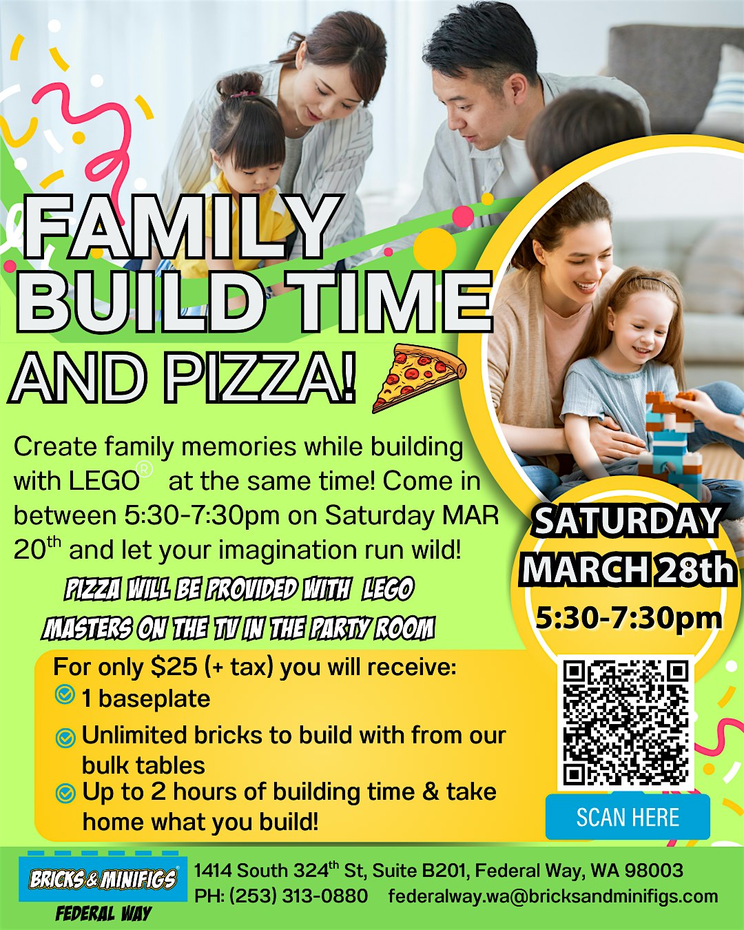 March FAMILY BUILD TIME & PIZZA at Bricks & Minifigs Federal Way – Federal Way, WA March FAMILY BUILD TIME & PIZZA at Bricks & Minifigs Federal Way – Federal Way, WA 2 2 people viewed this event. FAMILY BUILD TIME. Bring the Family, Bring your friends. Get a 32stud x 32stud baseplate and build for two hours from the bulk tables. Tickets-RSVP Link Register for event Date And Time Friday, March 27th, 2026 @ 05:00 PM Location 1414 South 324th Street, Federal Way, WA 98003 Event Types Party or Social Gathering Event Category TacomaWashington Share With Friends Facebook Twitter Linkedin Xing Pinterest