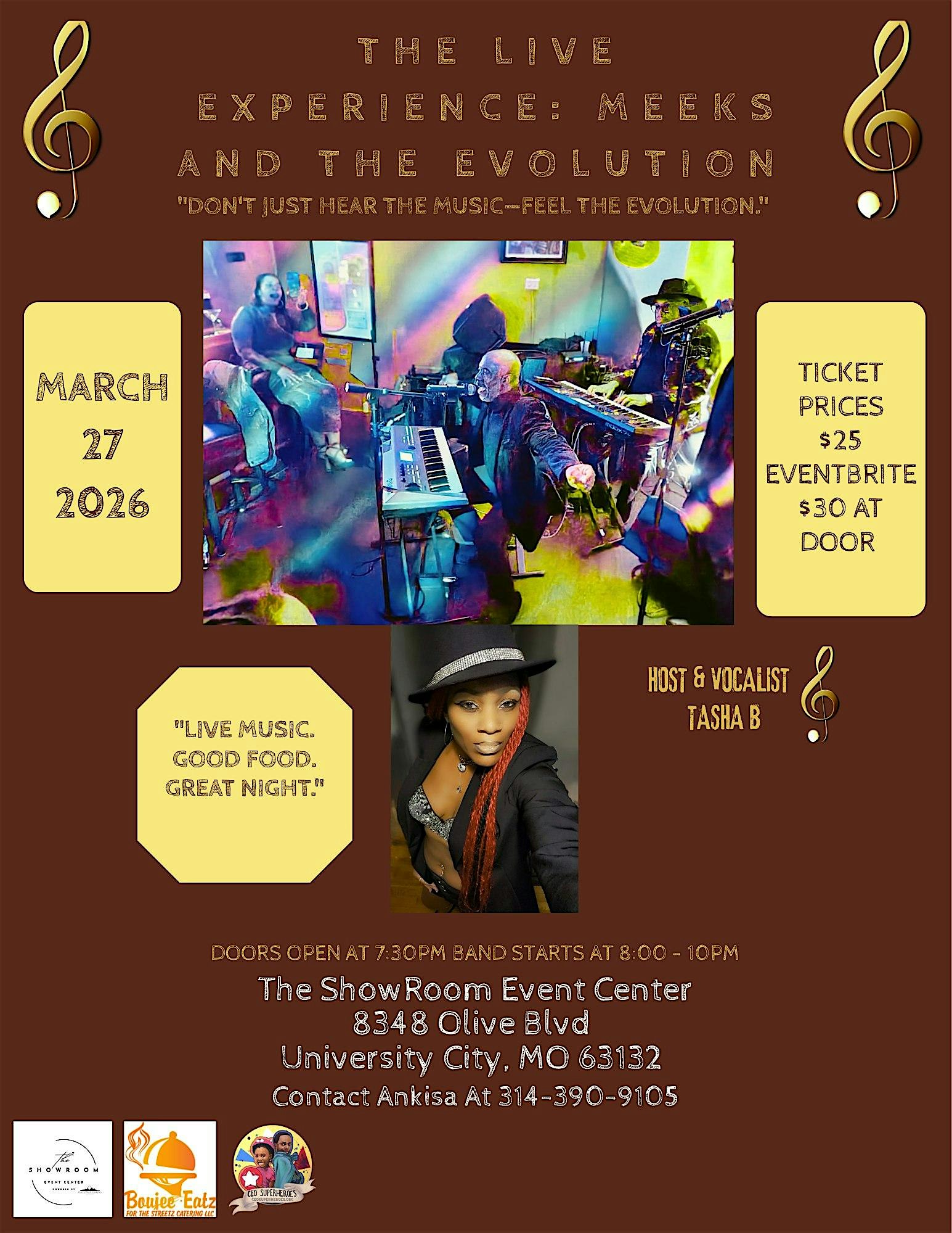 by admin24Feb Meeks and The Evolution LIVE: An Evening of Soul & Groove ft. Tasha B at The Showroom – St. Louis, MO Meeks and The Evolution LIVE: An Evening of Soul & Groove ft. Tasha B at The Showroom – St. Louis, MO 4 4 people viewed this event. Get ready for a night where soul meets stage! We are bringing together the powerhouse sounds of Meeks and The Evolution for a main-stage. Tickets-RSVP Link Date And Time Friday, March 27th, 2026 08:00 PM (PST) Venue The Showroom Location 8348 Olive Boulevard, St. Louis, MO 63132 Event Types Concert or PerformanceMusic Event Category MissouriSt. Louis Share With Friends Facebook Twitter Linkedin Xing Pinterest Share This Post: