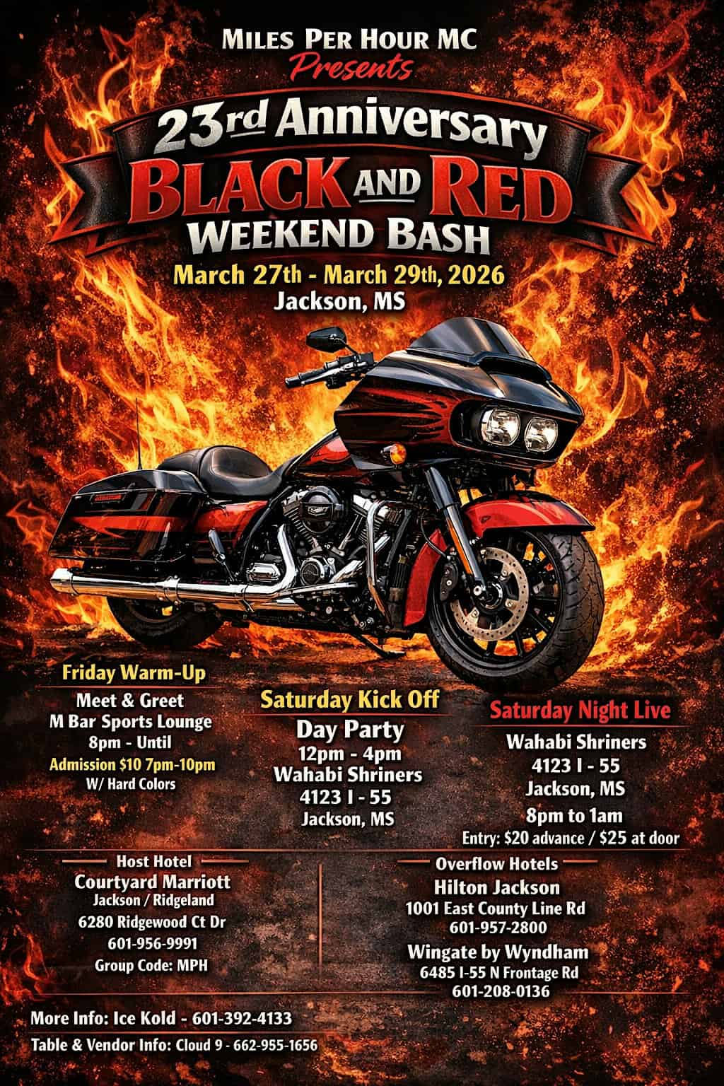 by admin23Feb Miles Per Hour MC 23rd Anniversary Weekend Bash at Wahabi Shriners – Jackson, MS Miles Per Hour MC 23rd Anniversary Weekend Bash at Wahabi Shriners – Jackson, MS 2 2 people viewed this event. Get ready to celebrate 23 years of pure motorcycle madness with the Miles Per Hour MC crew – it’s gonna be a wild ride! Tickets-RSVP Link Date And Time Friday, March 27th, 2026 07:00 PM (PST) Venue Wahabi Shriners Location 4123 Interstate 55, Jackson, MS 39212 Event Types MusicParty or Social Gathering Event Category JacksonMississippi Share With Friends Facebook Twitter Linkedin Xing Pinterest Share This Post: