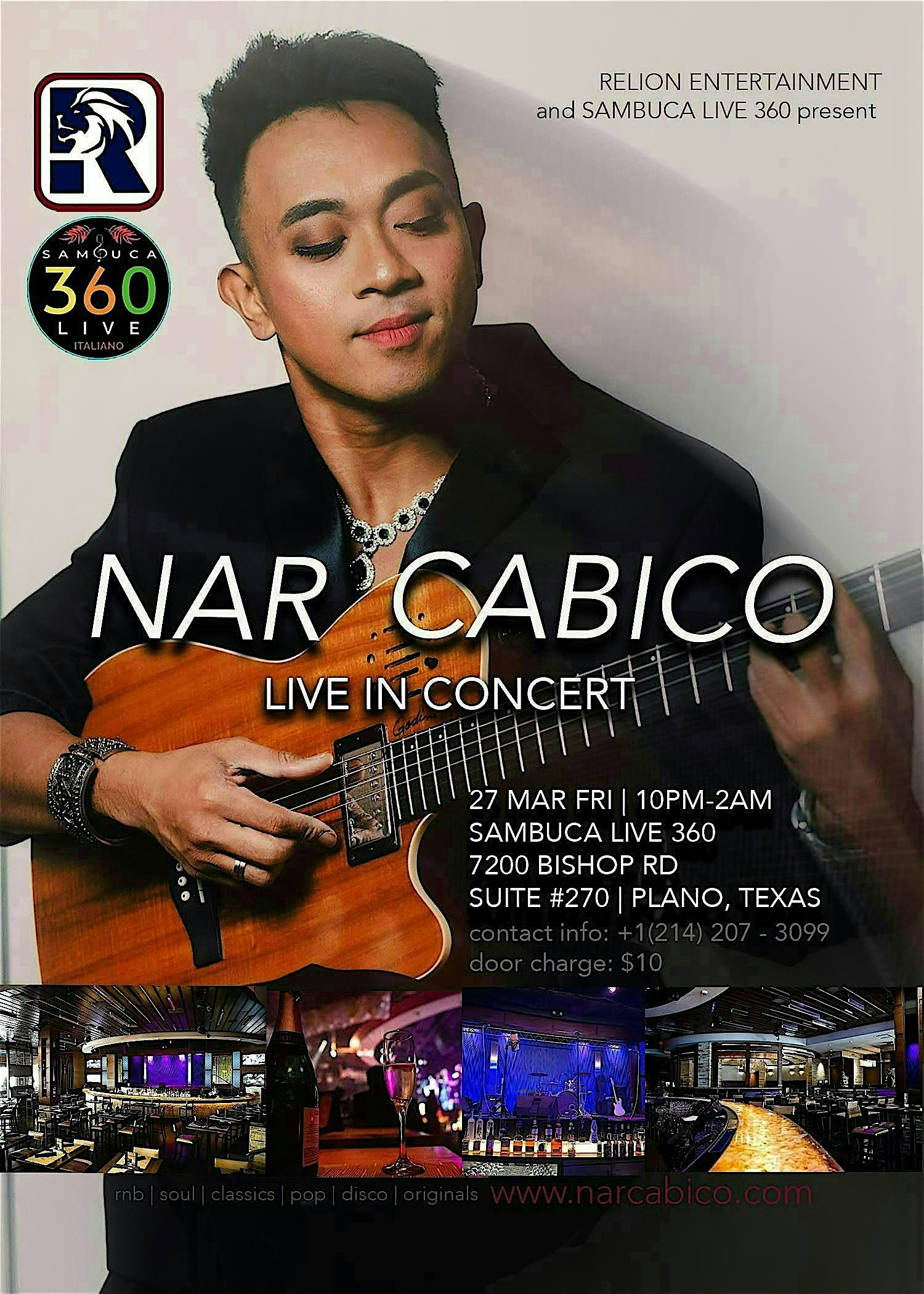 by admin24Feb NAR CABICO – LIVE IN CONCERT at Sambuca 360 Live – Plano, TX NAR CABICO – LIVE IN CONCERT at Sambuca 360 Live – Plano, TX 2 2 people viewed this event. Get ready for an epic night as Nar Cabico lights up the stage LIVE in concert! Tickets-RSVP Link Date And Time Friday, March 27th, 2026 10:00 PM (PST) Venue Sambuca 360 Live Location 7200 Bishop Road, Plano, TX 75024 Event Types Concert or PerformanceMusic Event Category DallasTexas Share With Friends Facebook Twitter Linkedin Xing Pinterest Share This Post: