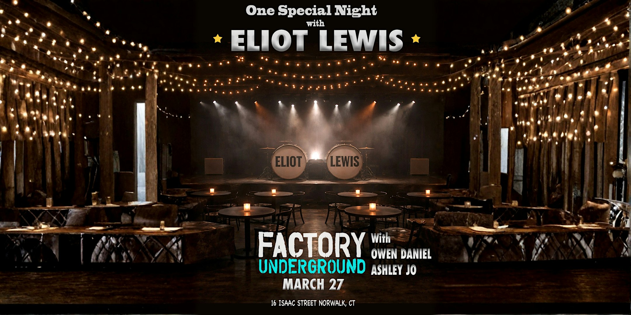 by admin13Feb One Special Night with Eliot Lewis at Factory Underground Studio – Norwalk, CT One Special Night with Eliot Lewis at Factory Underground Studio – Norwalk, CT 1 1 people viewed this event. Join us for an evening with Eliot Lewis and special guests Owen Daniel and Ashley Jo here at Factory Underground Studio! Tickets-RSVP Link Date And Time Friday, March 27th, 2026 11:00 PM (PST) Venue Factory Underground Studio Location 16 Isaacs Street, Norwalk, CT 6850 Event Types Concert or PerformanceMusic Event Category BridgeportConnecticut Share With Friends Facebook Twitter Linkedin Xing Pinterest Share This Post: