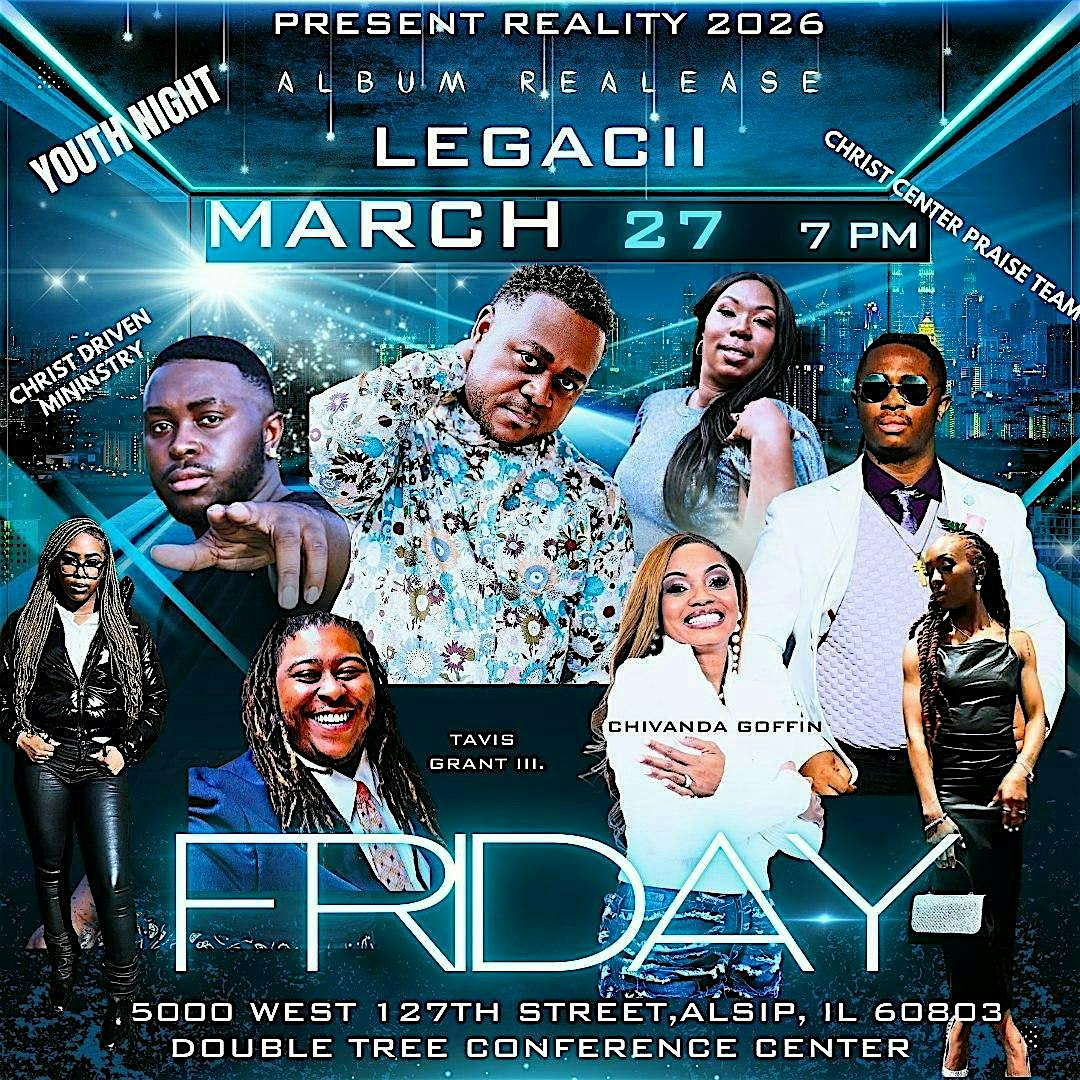 by admin24Feb Present Reality Concert/ Legacii Album Release at DoubleTree by Hilton Hotel Chicago – Alsip – Alsip, IL Present Reality Concert/ Legacii Album Release at DoubleTree by Hilton Hotel Chicago – Alsip – Alsip, IL 2 2 people viewed this event. The Present Reality Concert is coming to the CWAF Holy Convocation! Experience the highly anticipated concert and Album Release of Legacii. Tickets-RSVP Link Date And Time Friday, March 27th, 2026 07:00 PM (PST) Venue DoubleTree by Hilton Hotel Chicago - Alsip Location 5000 West 127th Street, Alsip, IL 60803 Event Types Concert or PerformanceMusic Event Category Illinois Share With Friends Facebook Twitter Linkedin Xing Pinterest Share This Post: