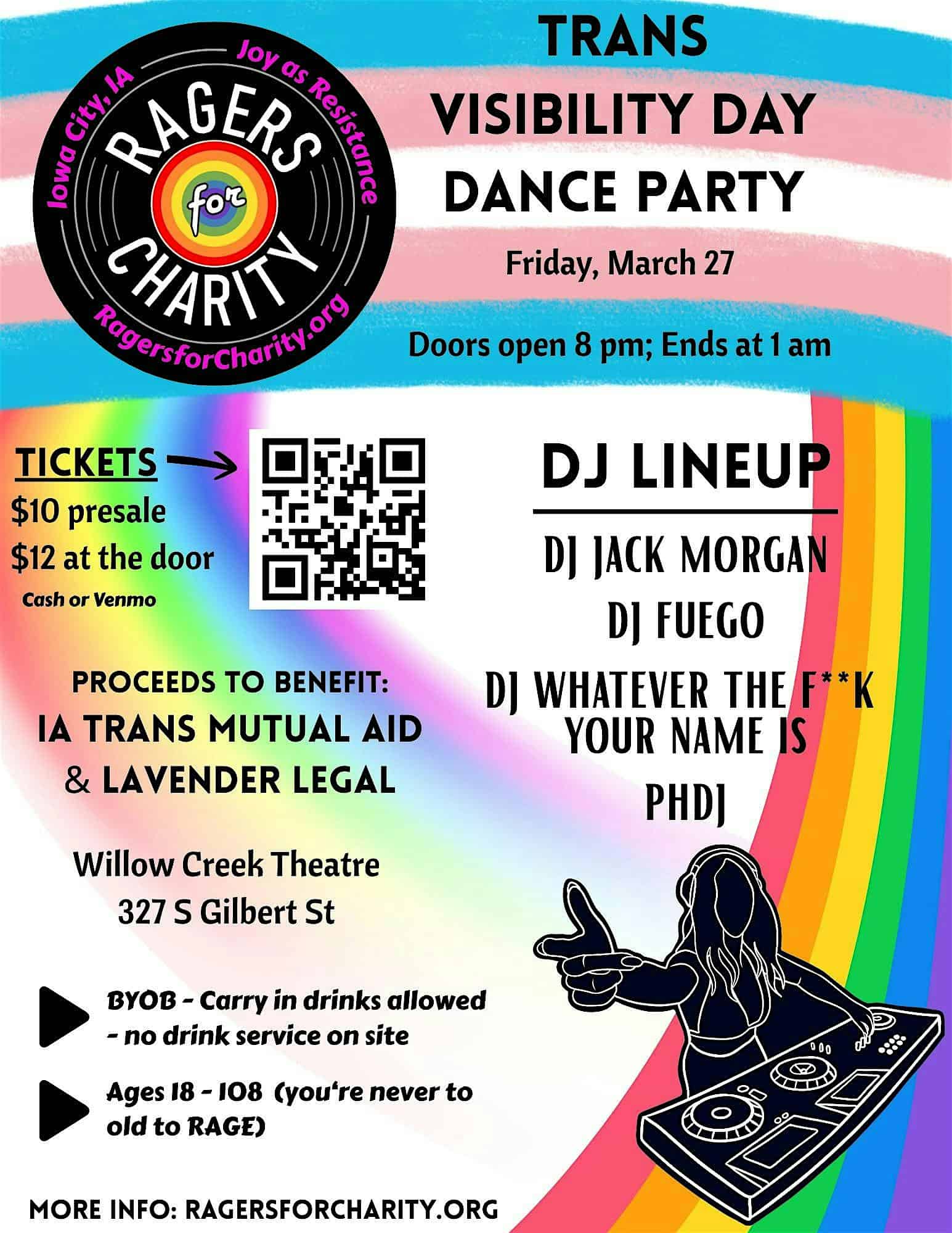 by admin23Feb Ragers for Charity at Willow Creek Theatre Company – Iowa City, IA Ragers for Charity at Willow Creek Theatre Company – Iowa City, IA 2 2 people viewed this event. Ragers for Charity: 4 great DJs, a great night of dancing, and all proceeds benefit Iowa Trans Mutual Aid and Lavender Legal Tickets-RSVP Link Date And Time Friday, March 27th, 2026 08:00 PM (PST) Venue Willow Creek Theatre Company Location 327 South Gilbert Street, Iowa City, IA 52240 Event Types Charity & CausesParty or Social Gathering Event Category Iowa Share With Friends Facebook Twitter Linkedin Xing Pinterest Share This Post: