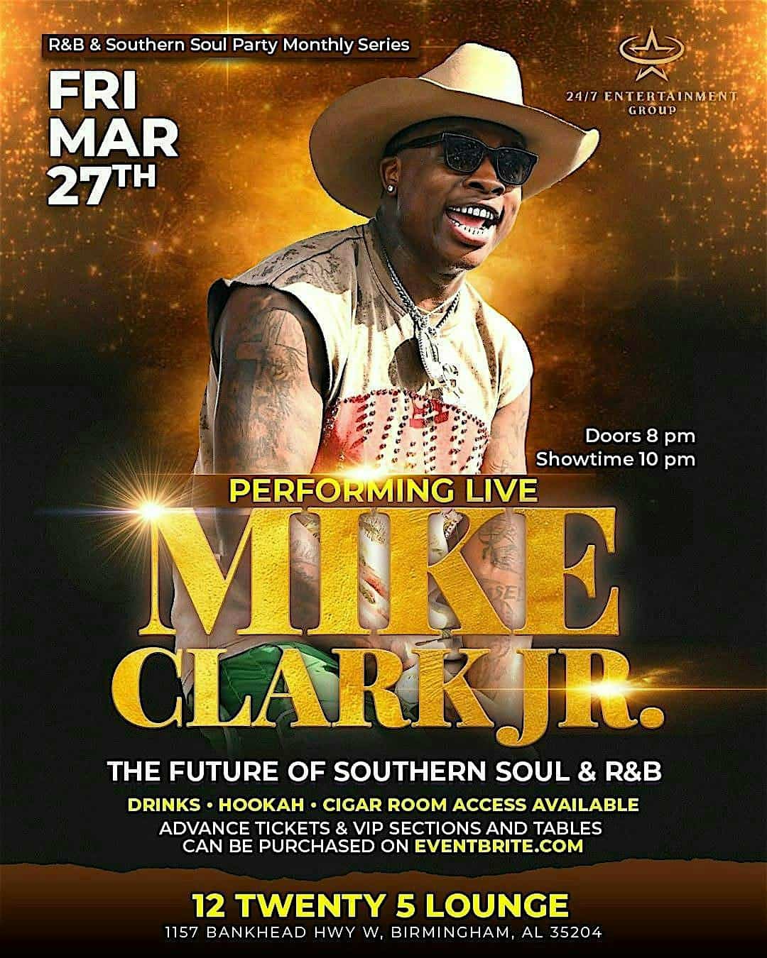 by admin23Feb R&B & SOUTHERN SOUL MONTHLY PARTY SERIES: MIKE CLARK JR. PERFORMING LIVE!! at 12 Twenty 5 Lounge – Birmingham, AL R&B & SOUTHERN SOUL MONTHLY PARTY SERIES: MIKE CLARK JR. PERFORMING LIVE!! at 12 Twenty 5 Lounge – Birmingham, AL 3 3 people viewed this event. Get ready to vibe with Mike Clark Jr. live as we bring you the hottest R&B & Southern Soul jams all night! Tickets-RSVP Link Date And Time Friday, March 27th, 2026 08:00 PM (PST) Venue 12 Twenty 5 Lounge Location 1157 Bankhead Highway West, Birmingham, AL 35204 Event Types MusicParty or Social Gathering Event Category AlabamaBirmingham Share With Friends Facebook Twitter Linkedin Xing Pinterest Share This Post:
