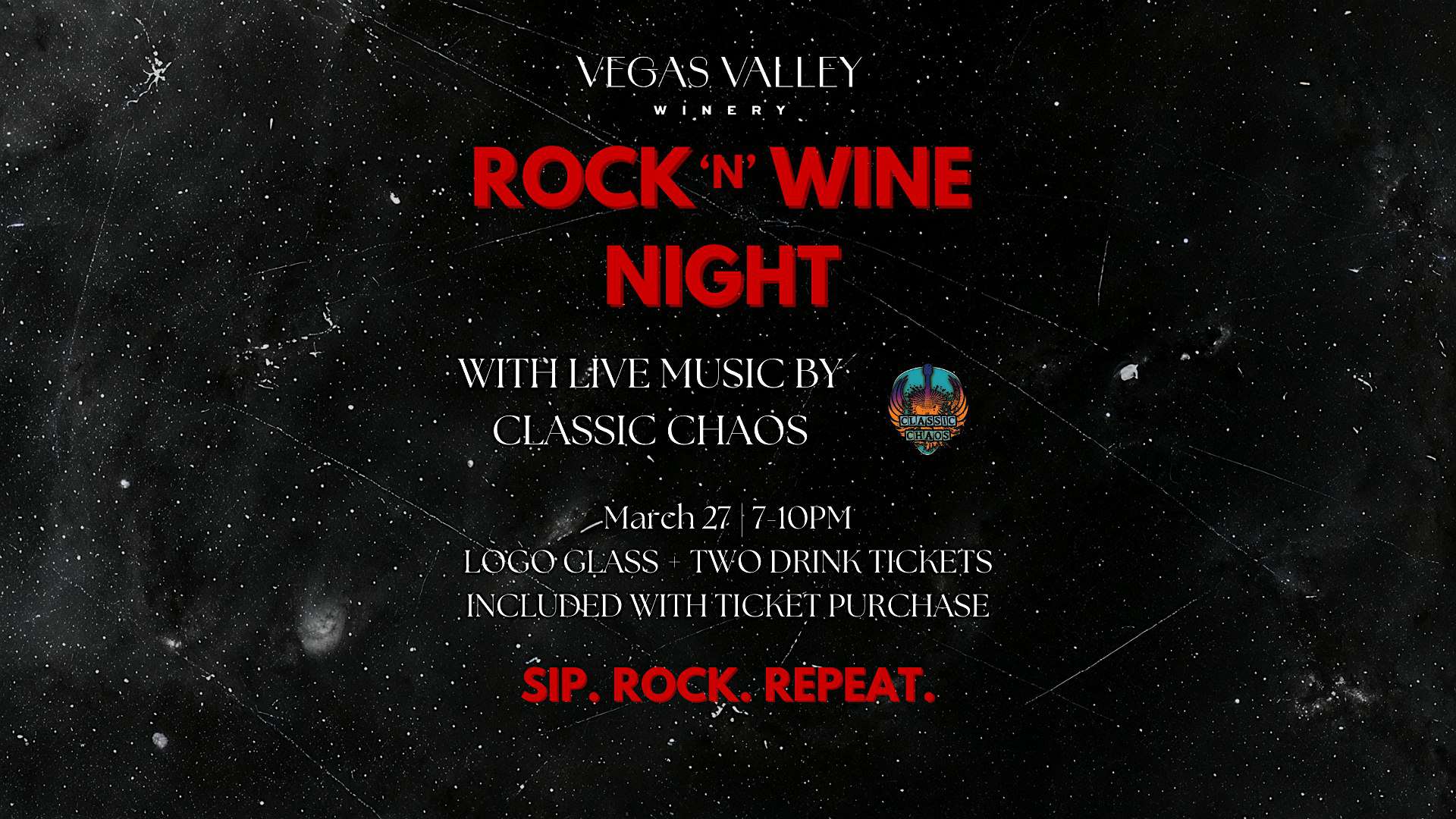 by admin23Feb Rock ‘N’ Wine – An Electric Night of Music & Wine at Vegas Valley Winery – Henderson, NV Rock ‘N’ Wine – An Electric Night of Music & Wine at Vegas Valley Winery – Henderson, NV 3 3 people viewed this event. Rock the night with live music by Classic Chaos, bold wines, glowing vibes, and a take-home logo glass. Tickets include 2 drinks! Tickets-RSVP Link Date And Time Friday, March 27th, 2026 07:00 PM (PST) Venue Vegas Valley Winery Location 7360 Eastgate Road, Henderson, NV 89011 Event Types Food & DrinkParty or Social Gathering Event Category Nevada Share With Friends Facebook Twitter Linkedin Xing Pinterest Share This Post: