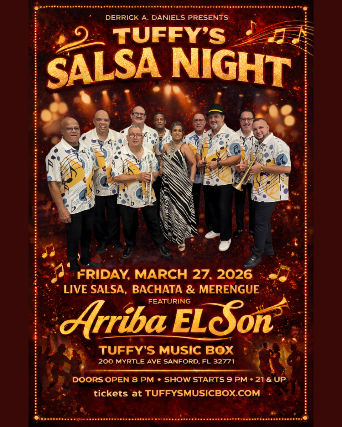 LIVE SALSA. BIG BAND ENERGY. NO SITTING STILL. When Arriba EL Son hits the stage at Tuffys Music Box : 200 Myrtle Ave Sanford, FL 32771 March 27, 2026: expect nonstop dancing, vibrant vibes, and a night youll be talking about for weeks.This isnt background music; its a full-on Latin dance experience presented by Derrick A Daniels Entertainment. Secure your spot early! www.tuffysmusicbox.com#DanceSanford #SalsaVibes #LatinMusicLive