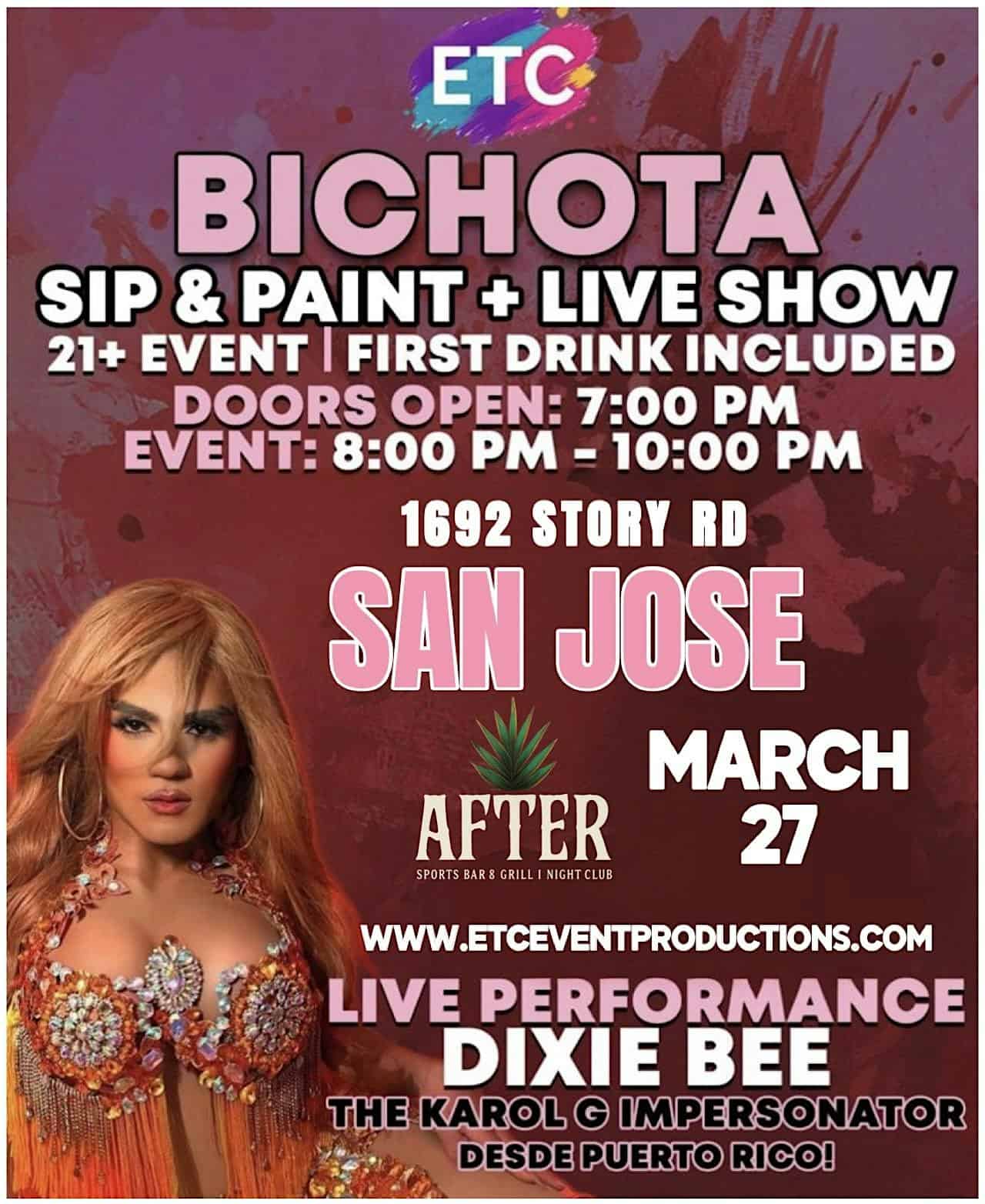 by admin23Feb SAN JOSE – KAROL G SIP & PAINT WITH IMPERSONATOR SHOW at After Bar & Grill – San Jose, CA SAN JOSE – KAROL G SIP & PAINT WITH IMPERSONATOR SHOW at After Bar & Grill – San Jose, CA 2 2 people viewed this event. SAN JOSE – KAROL G SIP & PAINT WITH IMPERSONATOR SHOW Tickets-RSVP Link Date And Time Friday, March 27th, 2026 07:00 PM (PST) Venue After Bar & Grill Location 1692 Story Road, San Jose, CA 95122 Event Types Party or Social GatheringPerforming & Visual Arts Event Category CaliforniaSan Jose Share With Friends Facebook Twitter Linkedin Xing Pinterest Share This Post: