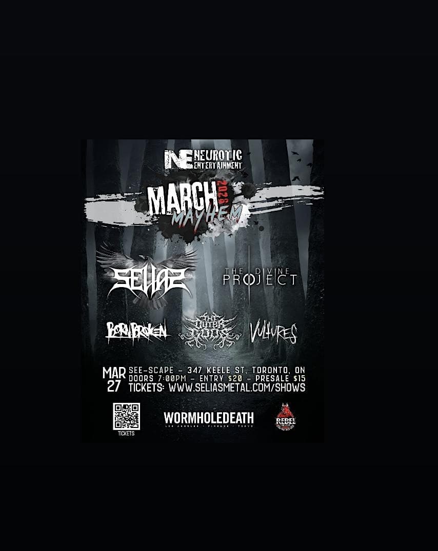 by admin14Feb Selias, The Divine Project, Born Broken, The Outer Gods & Vultures at See-Scape – Toronto, ON Selias, The Divine Project, Born Broken, The Outer Gods & Vultures at See-Scape – Toronto, ON 2 2 people viewed this event. Get ready to rock out with an electrifying lineup featuring Selias, The Divine Project, Born Broken, The Outer Gods & Vultures! Tickets-RSVP Link Date And Time Friday, March 27th, 2026 11:00 PM (PST) Venue See-Scape Location 347 Keele Street, Toronto, ON M6P 2K6 Event Types Concert or PerformancePerforming & Visual Arts Share With Friends Facebook Twitter Linkedin Xing Pinterest Share This Post: