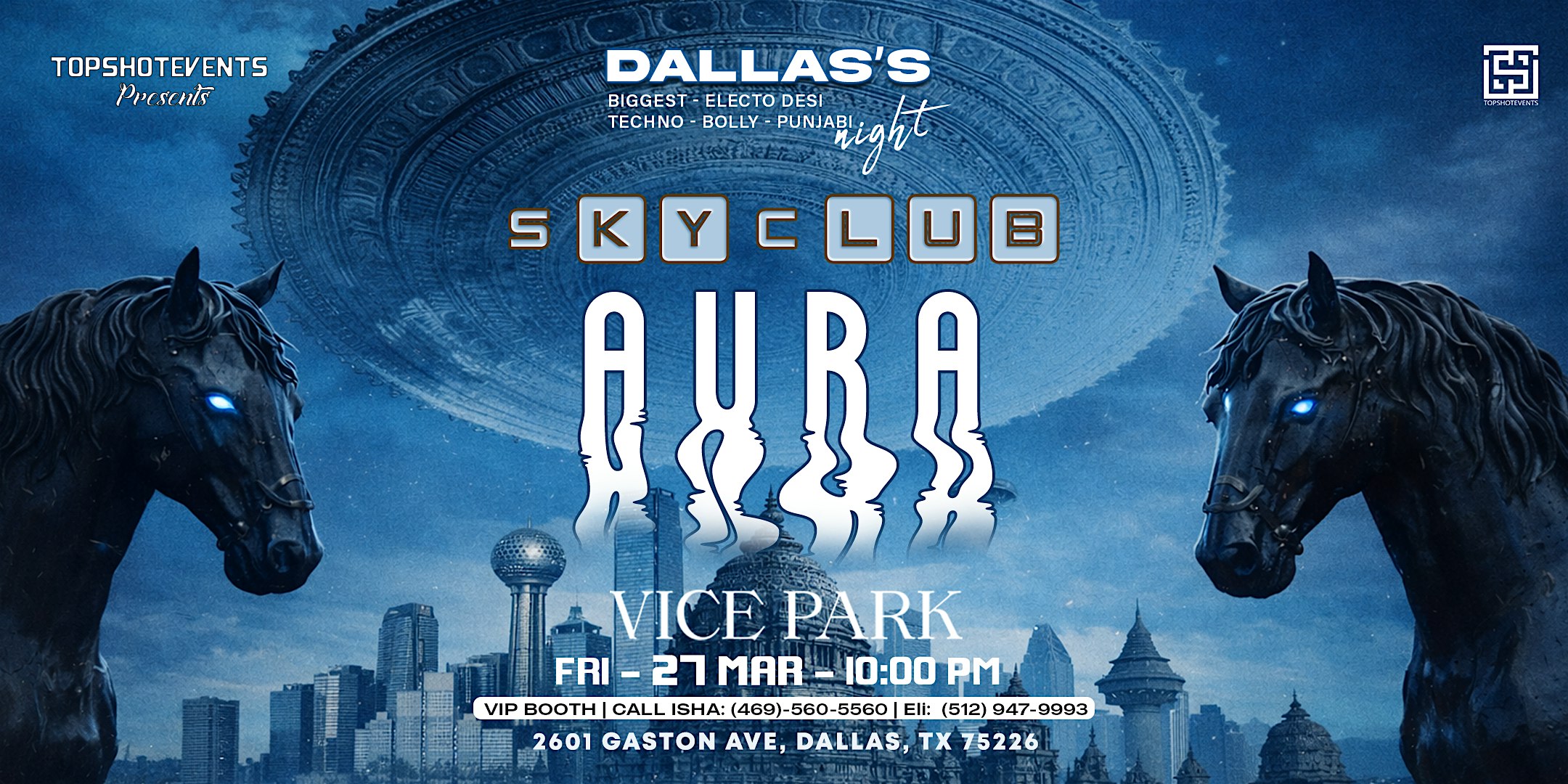 by admin24Feb SKYCLUB AURA EDITION | ELECTRO DESI HEIGHTS AT VICE PARK at Vice Park – Dallas, TX SKYCLUB AURA EDITION | ELECTRO DESI HEIGHTS AT VICE PARK at Vice Park – Dallas, TX 5 5 people viewed this event. Get ready to elevate your nightlife experience with SKYCLUB EDITION at DESI HEIGHTS – it’s going down at Vice Park! Tickets-RSVP Link Date And Time Friday, March 27th, 2026 @ 10:00 PM Location 2601 Gaston Avenue, Dallas, TX 75226 Event Types OtherParty or Social Gathering Event Category DallasTexas Share With Friends Facebook Twitter Linkedin Xing Pinterest Share This Post: