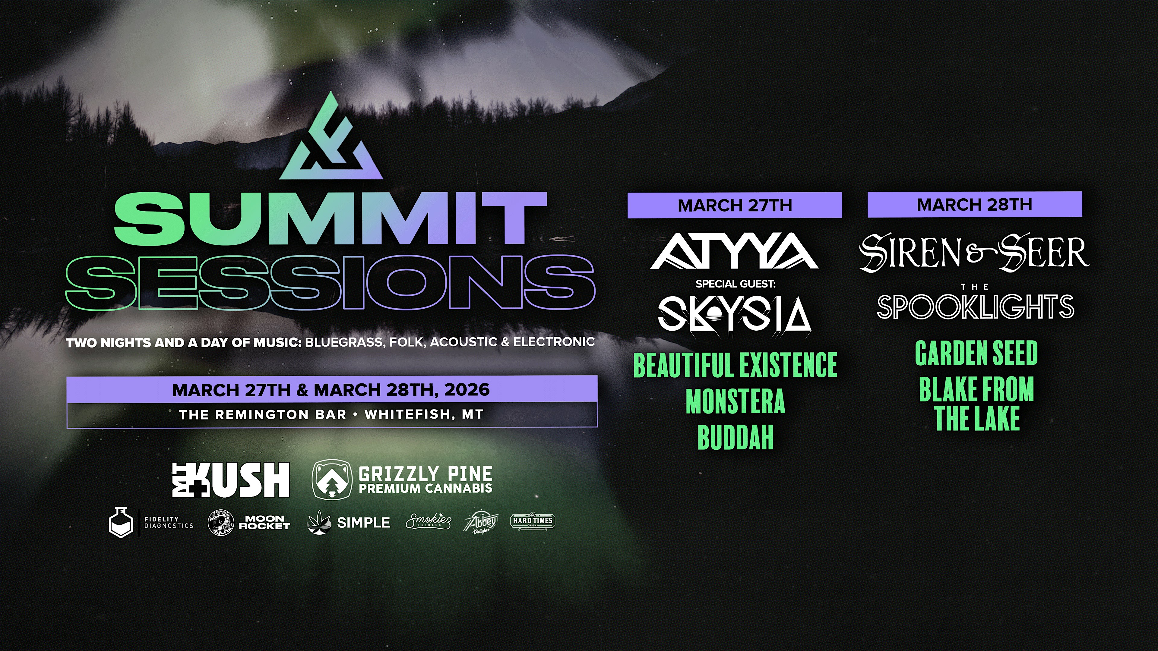 by admin24Feb SUMMIT SESSIONS at The Remington Bar – Whitefish, MT SUMMIT SESSIONS at The Remington Bar – Whitefish, MT 2 2 people viewed this event. Two nights. One immersive experience. A genre-bending weekend of bass, live electronic, and future-rooted sound in Montana. Tickets-RSVP Link Date And Time Friday, March 27th, 2026 08:00 PM (PST) Venue The Remington Bar Location 130 Central Avenue, Whitefish, MT 59937 Event Types Concert or PerformanceMusic Event Category Montana Share With Friends Facebook Twitter Linkedin Xing Pinterest Share This Post: