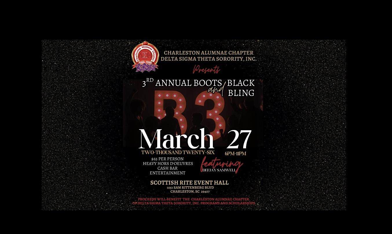 by admin23Feb The Charleston Alumnae Chapter invites you to our 3rd Annual B3 Roundup at Scottish Rite of Charleston – Charleston, SC The Charleston Alumnae Chapter invites you to our 3rd Annual B3 Roundup at Scottish Rite of Charleston – Charleston, SC 1 1 people viewed this event. Come party with us in your boots, black and bling! Tickets-RSVP Link Date And Time Friday, March 27th, 2026 @ 06:00 PM Location 1051 Sam Rittenberg Boulevard, Charleston, SC 29407 Event Types Charity & CausesParty or Social Gathering Event Category CharlestonSouth Carolina Share With Friends Facebook Twitter Linkedin Xing Pinterest Share This Post: