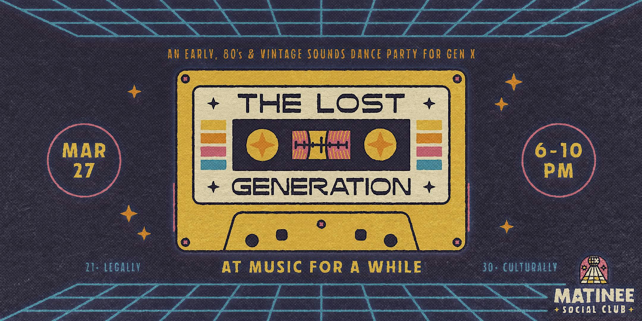 by admin13Feb The Lost Generation [80s + Gen X Matinee] at Music For A While – New York, NY The Lost Generation [80s + Gen X Matinee] at Music For A While – New York, NY 2 2 people viewed this event. An early, 80s & vintage sounds dance party with for Gen X – presented by Matinee Social Club @ Music for a While in Chelsea. Tickets-RSVP Link Date And Time Friday, March 27th, 2026 10:00 PM (PST) Venue Music For A While Location 518 West 27th Street, New York, NY 10001 Event Types MusicParty or Social Gathering Event Category New YorkNew York City Share With Friends Facebook Twitter Linkedin Xing Pinterest Share This Post: