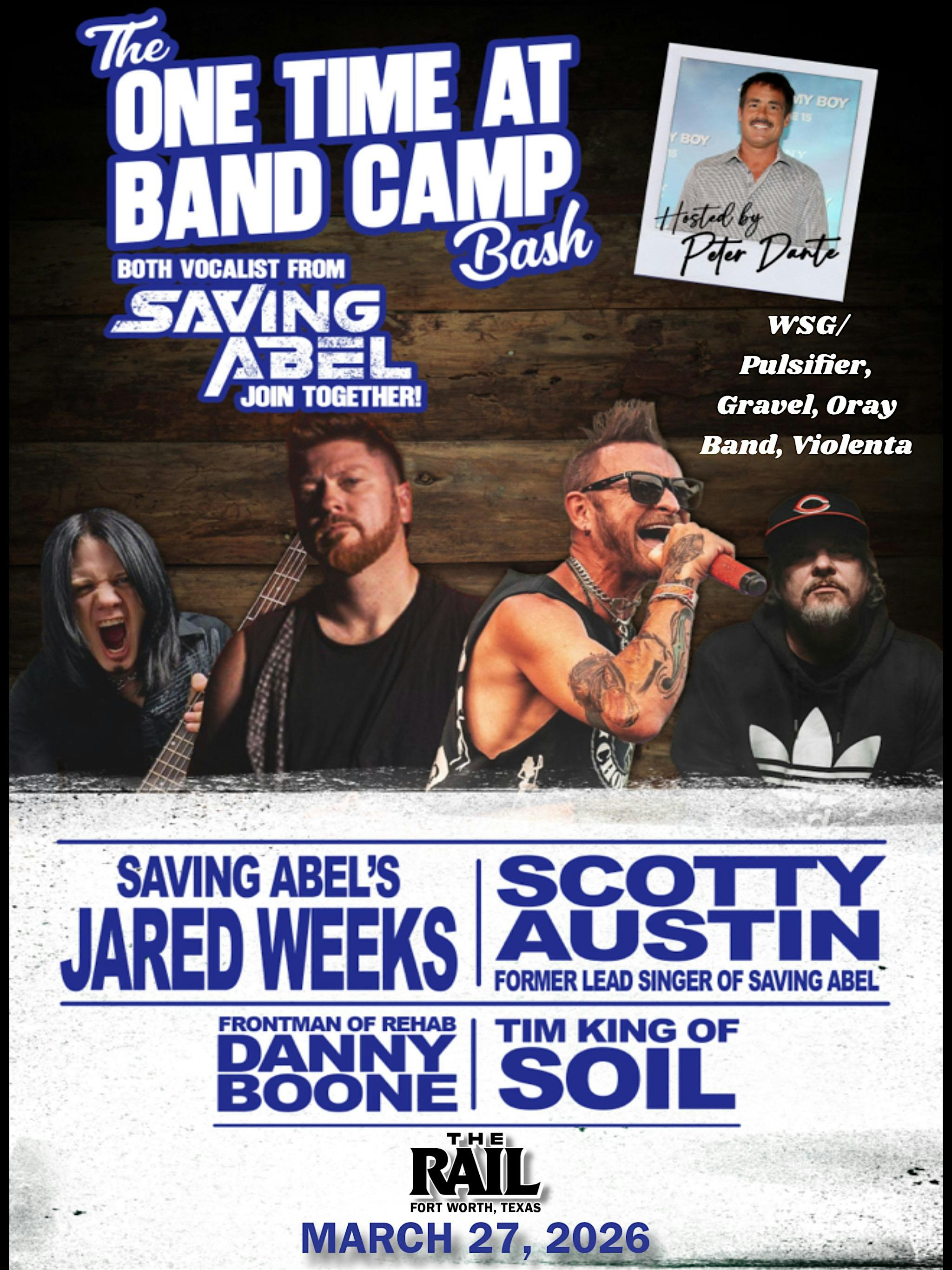 by admin24Feb The One Time at Band Camp Bash at The Rail at The Rail – Fort Worth, TX The One Time at Band Camp Bash at The Rail at The Rail – Fort Worth, TX 2 2 people viewed this event. Join us at The Rail on 3/27 for THE ONE TIME AT BAND CAMP BASH featuring both vocalist of Saving Abel and a ton more. Hosted by Peter Dante! Tickets-RSVP Link Date And Time Friday, March 27th, 2026 05:00 PM (PST) Venue The Rail Location 3101 Joyce Drive, Fort Worth, TX 76116 Event Types Concert or PerformanceMusic Event Category Fort WorthTexas Share With Friends Facebook Twitter Linkedin Xing Pinterest Share This Post: