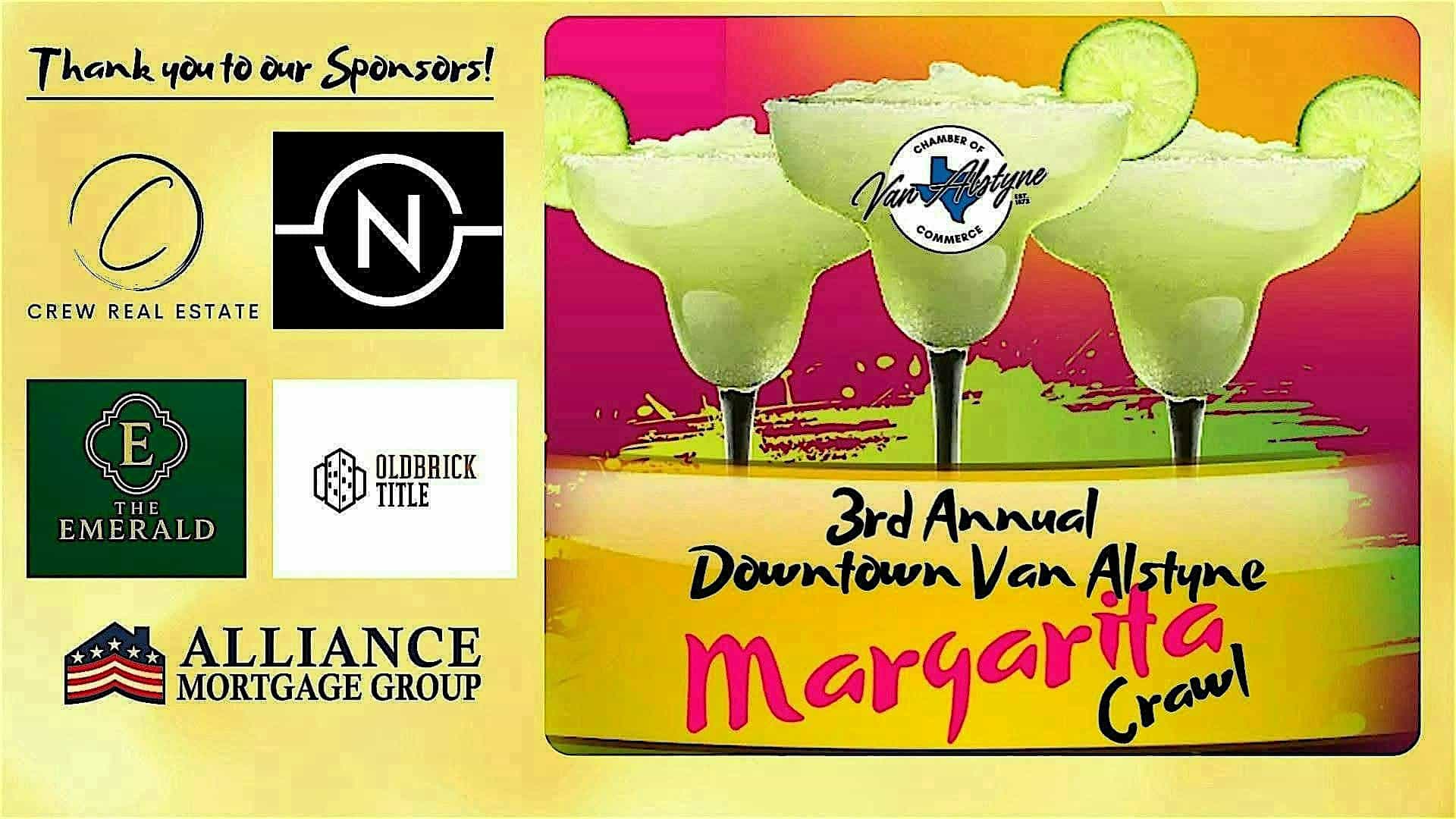 by admin14Feb 3rd Annual Downtown Van Alstyne Margarita Crawl at 120 E Marshall St – Van Alstyne, TX 3rd Annual Downtown Van Alstyne Margarita Crawl at 120 E Marshall St – Van Alstyne, TX 1 1 people viewed this event. Enjoy an afternoon of margaritas, shopping, and small-town charm! Tickets-RSVP Link Date And Time Saturday, March 28th, 2026 06:00 PM (PST) Venue 120 E Marshall St Location 120 East Marshall Street, Van Alstyne, TX 75495 Event Types Festival or FairFood & Drink Event Category Texas Share With Friends Facebook Twitter Linkedin Xing Pinterest Share This Post: