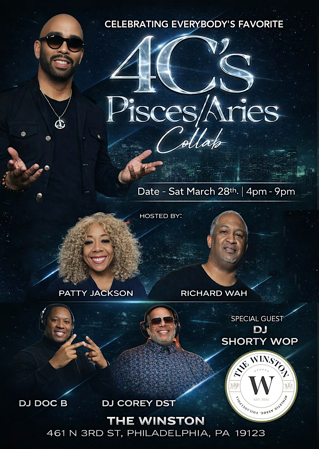 by admin23Feb 4C’s Pisces/ Aries Collab at The Winston Social Club – Philadelphia, PA 4C’s Pisces/ Aries Collab at The Winston Social Club – Philadelphia, PA 1 1 people viewed this event. Come and celebrate Everybody’s Favorite Mr 4C as he celebrates his birthday with some of his favorite Pisces and Aries. Tickets-RSVP Link Date And Time Saturday, March 28th, 2026 04:00 PM (PST) Venue The Winston Social Club Location 461 North 3rd Street, Philadelphia, PA 19123 Event Types Party or Social Gathering Event Category PennsylvaniaPhiladelphia Share With Friends Facebook Twitter Linkedin Xing Pinterest Share This Post: