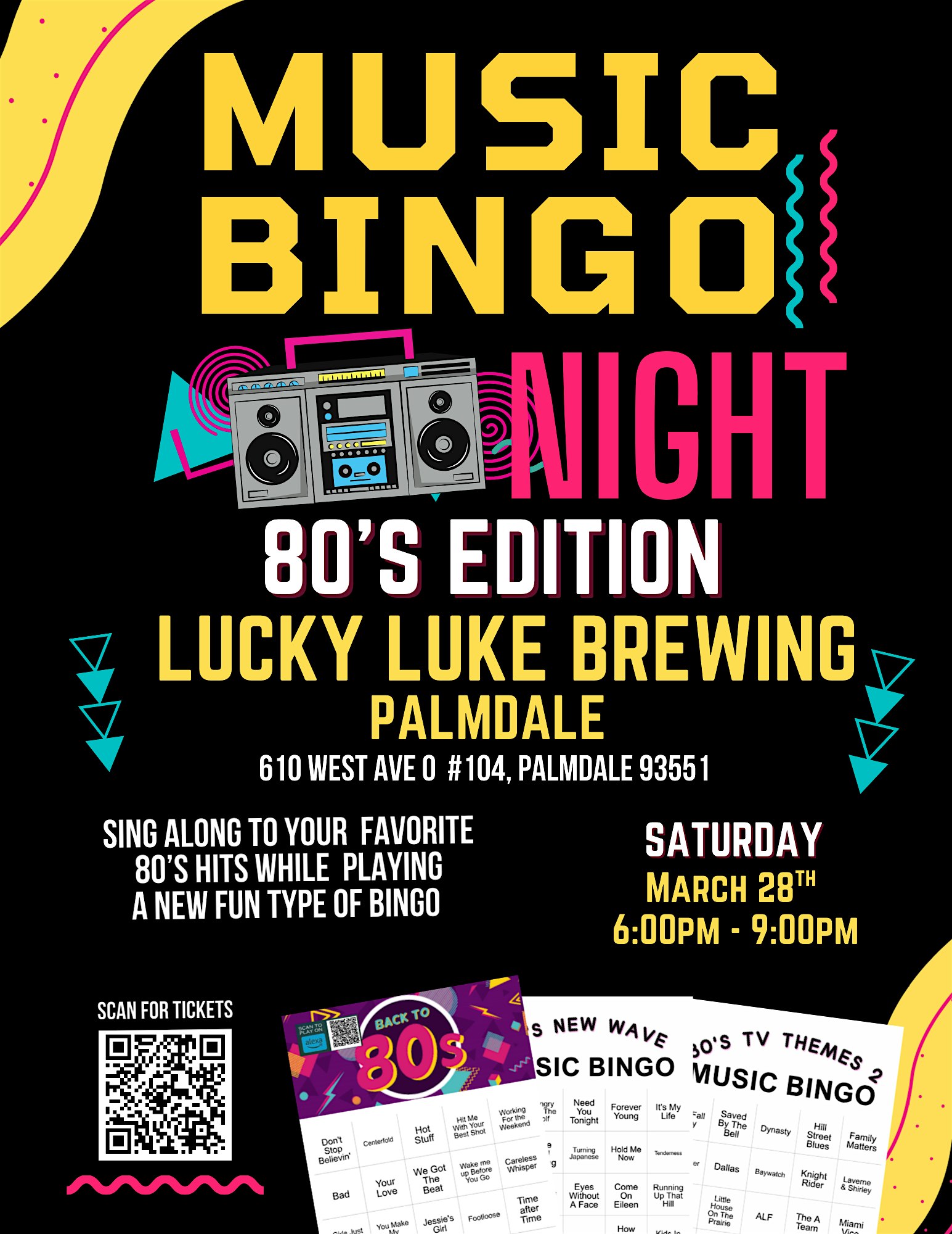 by admin27Feb 80’s Music Bingo Night @ Lucky Luke Brewing Palmdale at Lucky Luke Brewing – Palmdale, CA 80’s Music Bingo Night @ Lucky Luke Brewing Palmdale at Lucky Luke Brewing – Palmdale, CA 1 1 people viewed this event. 80’s Music Bingo Night Coming to Lucky Luke Brewing in Palmdale California. March 28th at 6 PM A night full of 80’s Genres Tickets-RSVP Link Date And Time Saturday, March 28th, 2026 06:00 PM (PST) Venue Lucky Luke Brewing Location 610 West Avenue O, Palmdale, CA 93551 Event Types MusicParty or Social Gathering Event Category California Share With Friends Facebook Twitter Linkedin Xing Pinterest Share This Post: