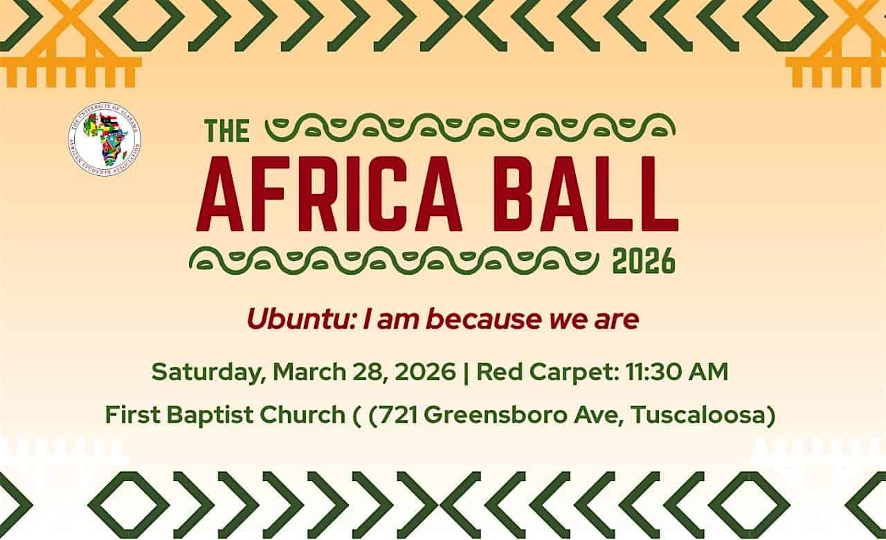 by admin23Feb Africa Ball 2026 – Ubuntu: I am because we are at First Baptist Church, Greensboro Avenue, Tuscaloosa, AL, USA – Tuscaloosa, AL Africa Ball 2026 – Ubuntu: I am because we are at First Baptist Church, Greensboro Avenue, Tuscaloosa, AL, USA – Tuscaloosa, AL 1 1 people viewed this event. Africa Ball 2026 celebrates Ubuntu—unity, culture, elegance, and community at The University of Alabama. Tickets-RSVP Link Date And Time Saturday, March 28th, 2026 11:00 AM (PST) Venue First Baptist Church, Greensboro Avenue, Tuscaloosa, AL, USA Location 721 Greensboro Avenue, Tuscaloosa, AL 35401 Event Types Community & CultureParty or Social Gathering Event Category Alabama Share With Friends Facebook Twitter Linkedin Xing Pinterest Share This Post: