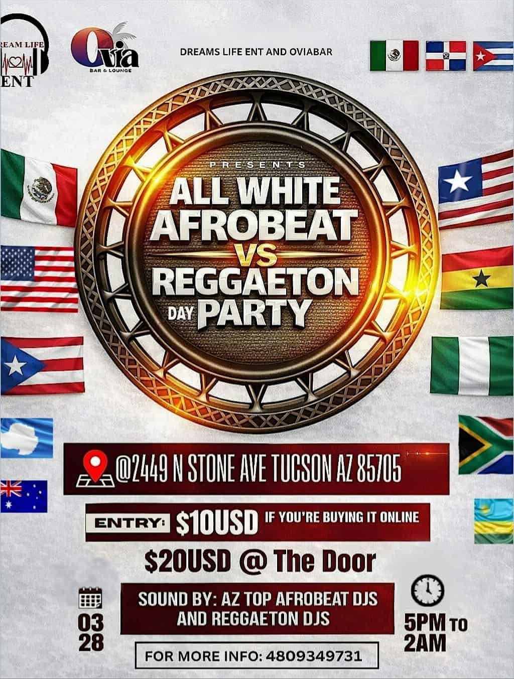 by admin23Feb ALL WHITE AFROBEAT VS REGGAETON DAY PARTY at Ovia Bar and Lounge – Tucson, AZ ALL WHITE AFROBEAT VS REGGAETON DAY PARTY at Ovia Bar and Lounge – Tucson, AZ 1 1 people viewed this event. All White Afrobeat VS REGGAETON is about two culture coming together through music, so come sit and let the musical vibe blow your mind way Tickets-RSVP Link Date And Time Saturday, March 28th, 2026 05:00 PM (PST) Venue Ovia Bar and Lounge Location 2449 North Stone Avenue, Tucson, AZ 85705 Event Types Party or Social Gathering Event Category ArizonaTucson Share With Friends Facebook Twitter Linkedin Xing Pinterest Share This Post: