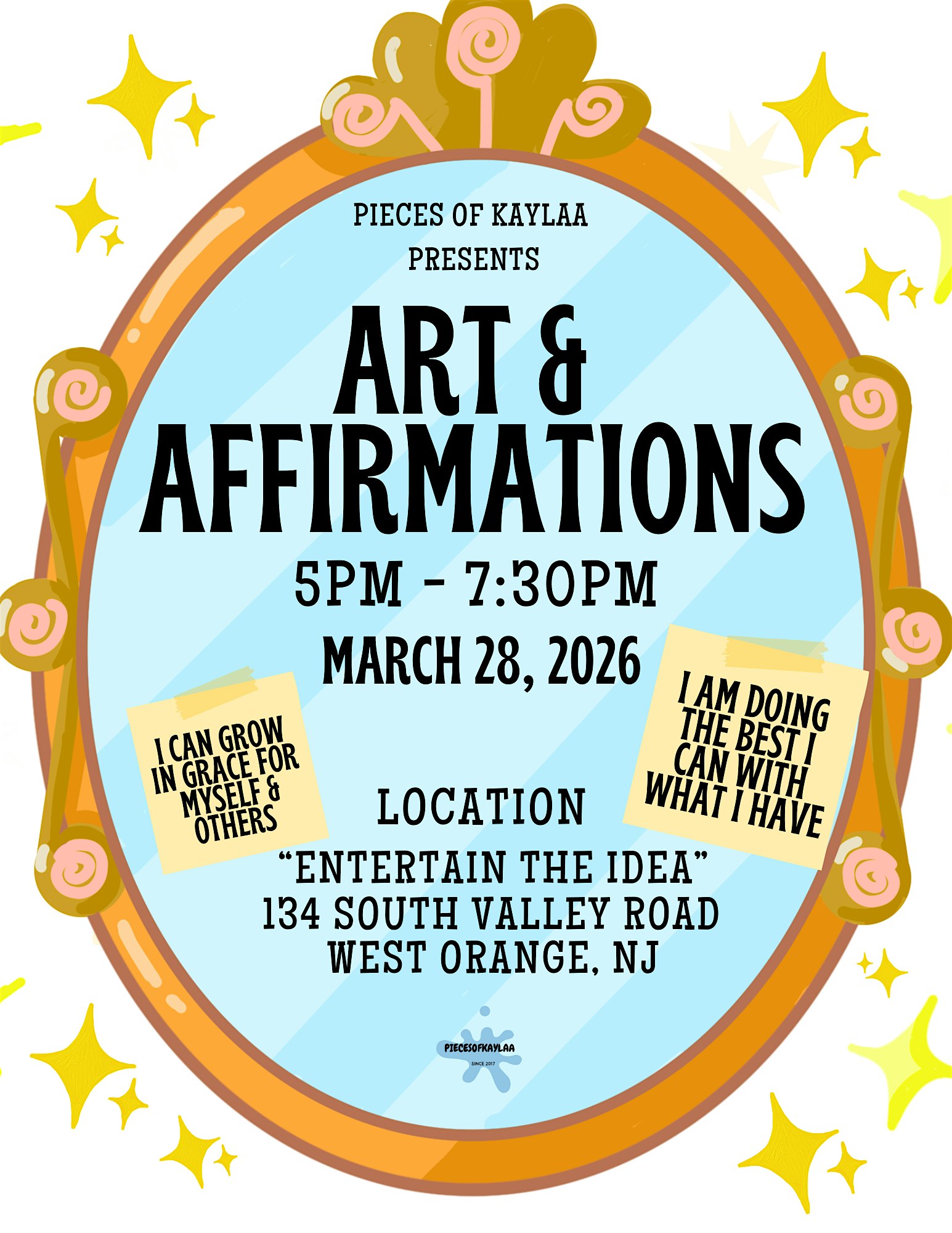 by admin13Feb Art & Affirmations at 134 S Valley Rd – West Orange, NJ Art & Affirmations at 134 S Valley Rd – West Orange, NJ 1 1 people viewed this event. Your reflection deserves kindness. Come paint with us at art and affirmations and pour a little love back into yourself. Tickets-RSVP Link Date And Time Saturday, March 28th, 2026 09:00 PM (PST) Venue 134 S Valley Rd Location 134 South Valley Road, West Orange, NJ 7052 Event Types Party or Social GatheringPerforming & Visual Arts Event Category New Jersey Share With Friends Facebook Twitter Linkedin Xing Pinterest Share This Post: