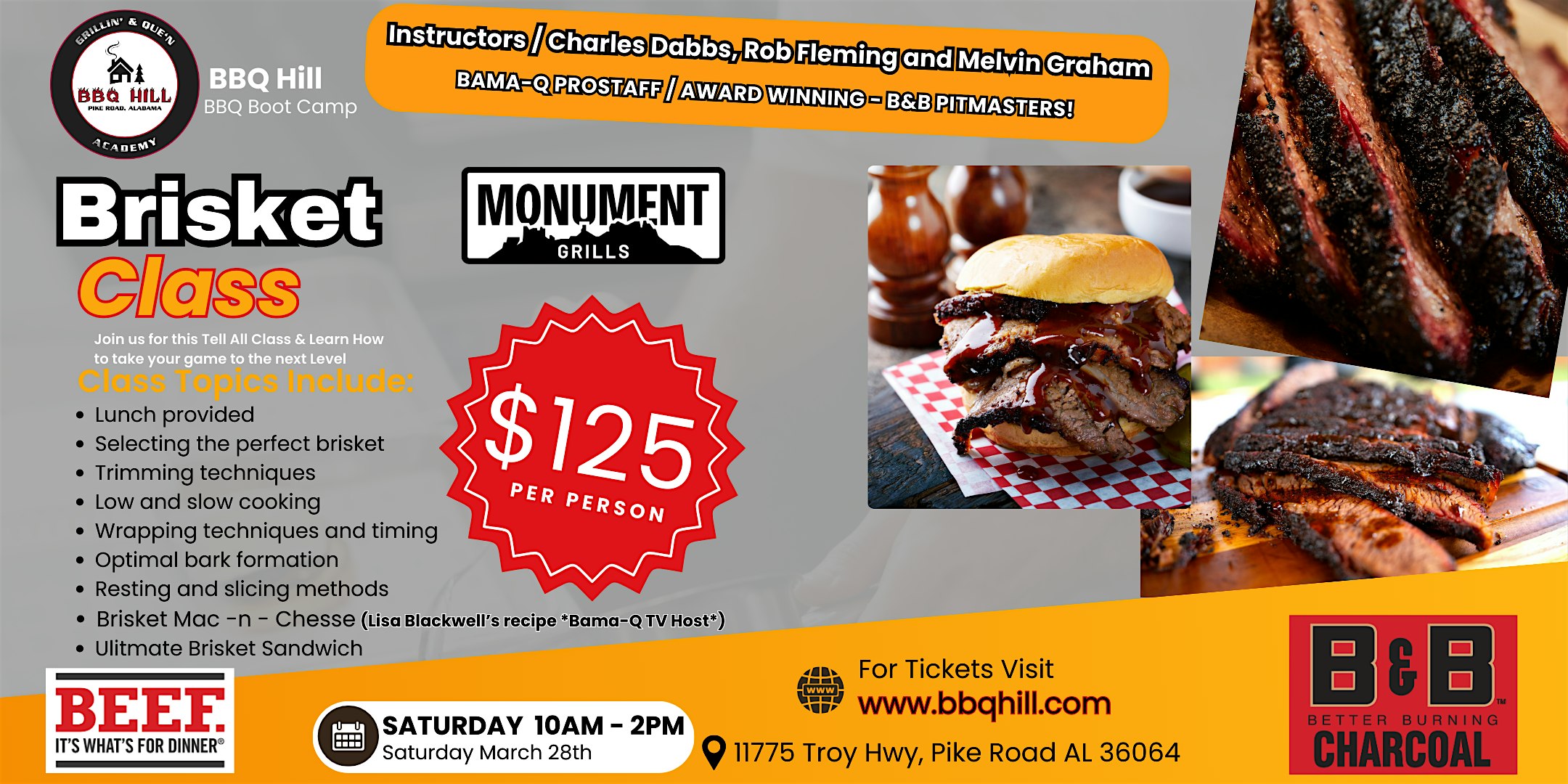by admin27Feb BBQ Hill’s Brisket Class at 11775 Troy Hwy – Pike Road, AL BBQ Hill’s Brisket Class at 11775 Troy Hwy – Pike Road, AL 1 1 people viewed this event. Get ready to master the art of smoking brisket and impress everyone at your next BBQ bash! Tickets-RSVP Link Date And Time Saturday, March 28th, 2026 10:00 AM (PST) Venue 11775 Troy Hwy Location 11775 Troy Highway, Pike Road, AL 36064 Event Types Food & Drink Event Category Alabama Share With Friends Facebook Twitter Linkedin Xing Pinterest Share This Post: