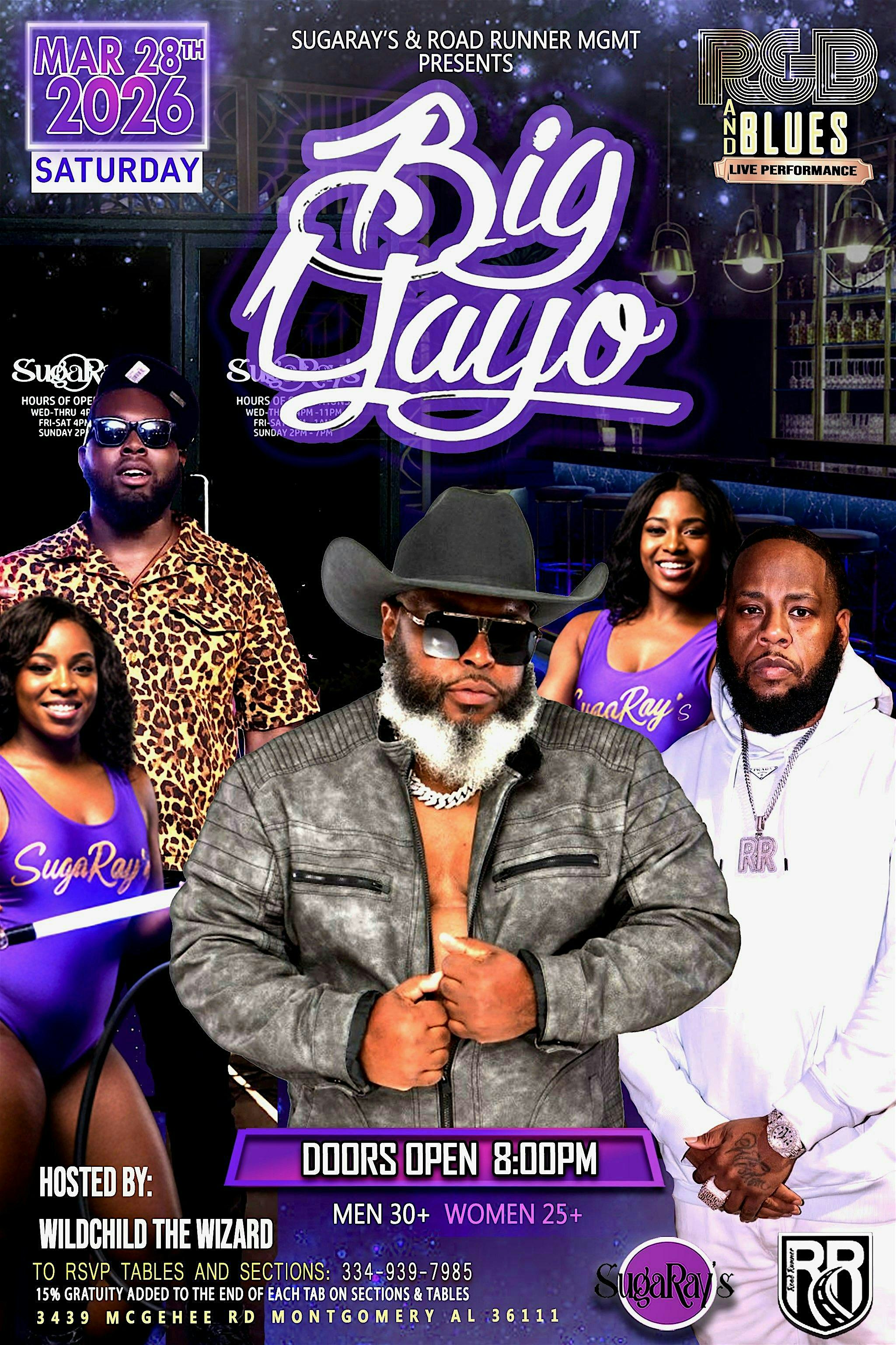 by admin24Feb Big Yayo Live at SugaRay’s at 3439 McGehee Rd – Montgomery, AL Big Yayo Live at SugaRay’s at 3439 McGehee Rd – Montgomery, AL 2 2 people viewed this event. Get ready to vibe with Big Yayo Live at Sugarays—an epic night of beats and good times in person! Doors open at 7pm show time 9pm Tickets-RSVP Link Date And Time Saturday, March 28th, 2026 07:00 PM (PST) Venue 3439 McGehee Rd Location 3439 McGehee Road, Montgomery, AL 36111 Event Types Concert or PerformanceMusic Event Category Alabama Share With Friends Facebook Twitter Linkedin Xing Pinterest Share This Post: