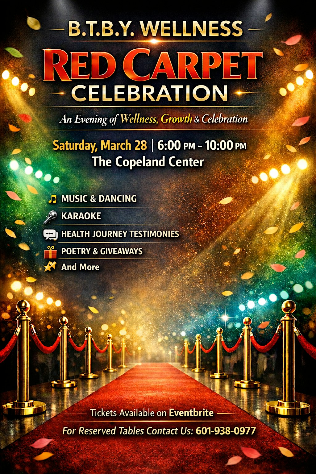by admin13Feb BTBY Wellness Red Carpet Celebration at Copeland Center – Meridian, MS BTBY Wellness Red Carpet Celebration at Copeland Center – Meridian, MS 2 2 people viewed this event. This special night honors health journeys, growth, and becoming the best version of yourself — physically, mentally, and spiritually. Tickets-RSVP Link Date And Time Saturday, March 28th, 2026 11:00 PM (PST) Venue Copeland Center Location 2501 4th Street, Meridian, MS 39301 Event Types Party or Social Gathering Event Category Mississippi Share With Friends Facebook Twitter Linkedin Xing Pinterest Share This Post: